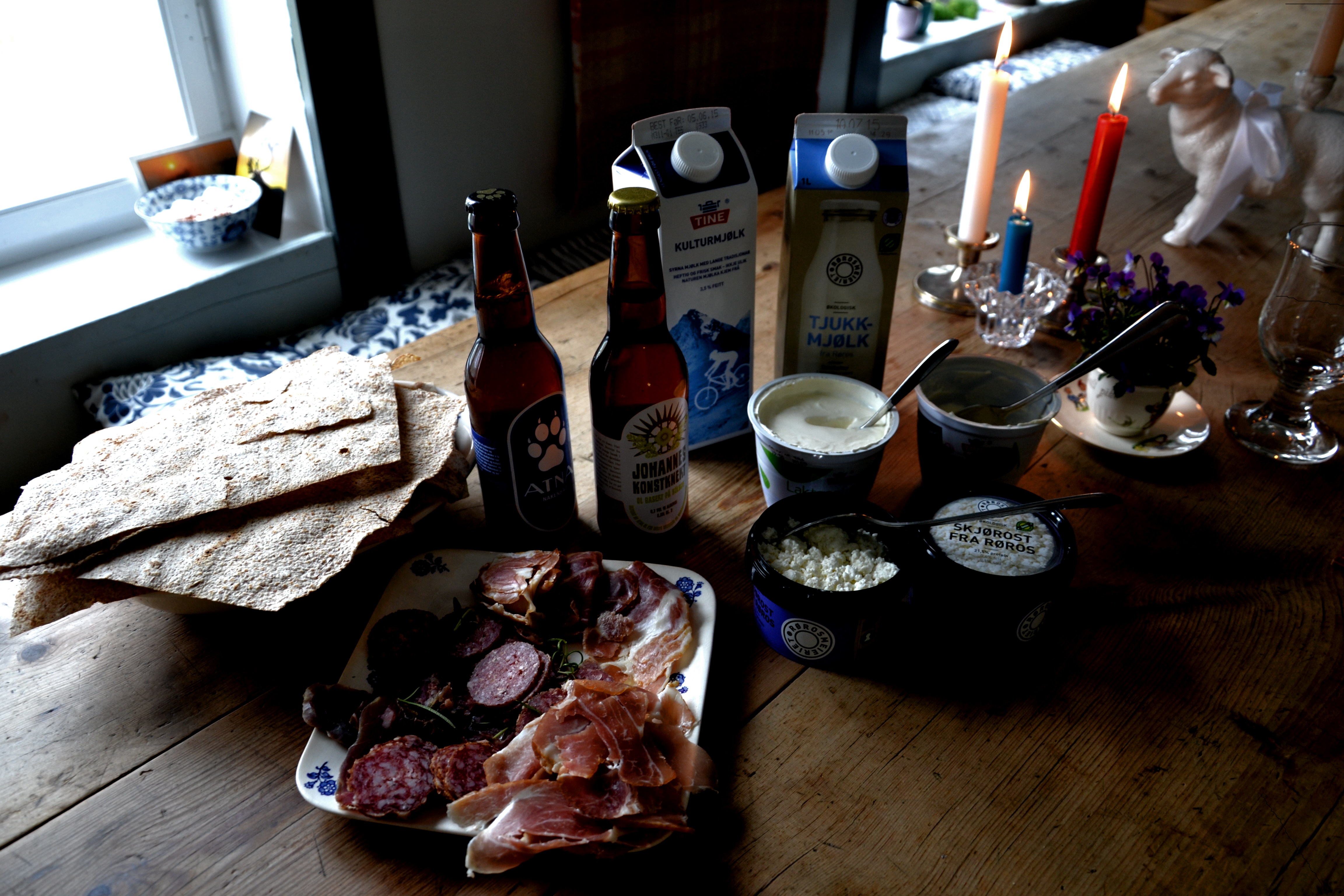 Alt er klart for et herlig måltid med mye kortreist mat, for oss som liker østerdalskost. Her er skjørost og tjukkmjølk fra Røros, hjemmebakt flatbrød fra tante på Tynset, spekemat fra Heidrun og for å slukke tørsten, har vi valgt Atnaøl.