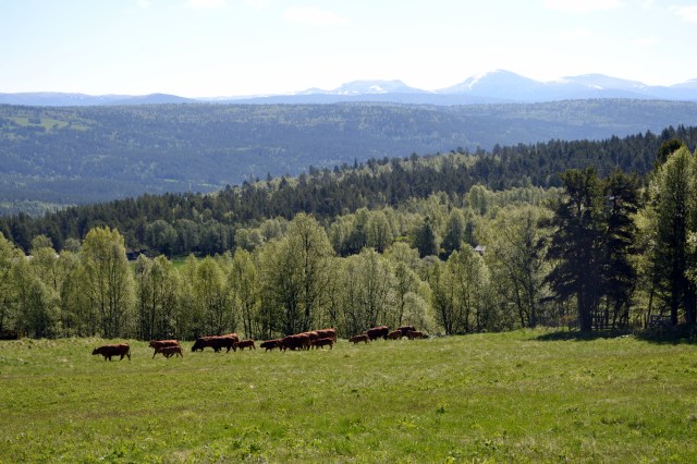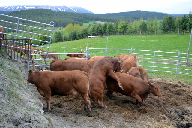 Bilen kom som avtalt og første gruppe, kalvene og mamma Mø, det vil si Dokka, ble lokket gjennom kveet som vi hadde satt opp på forhånd, bort til den store bilen. Så langt, alt vel. Men da var det stopp, ikke tale om at Dokka skulle opp på lemmen og inn i bilen! Husbonden klarte til slutt å lokke henne med en bøtte kraftfôr, men samtidig ble et par av kalvene skremt, bråsnudde og løp feil vei tilbake i kveet. Da var det på’n igjen og få dem mot bilen. Da gikk det heldigvis greit å få dem etter morkua inn på bilen. Så var det de andre ni og oksen sin tur. Først fem – det gikk uten problem, men de fem siste var mer vrange og var heller ikke så interessert i dette påfunnet fra bondemenneskene! Men til slutt var alle 21 trygt inne på bilen, og kursen ble satt mot sætervangen. Selv kjørte jeg etter med traktoren og dermed var jeg ikke til stede da de ble sluppet ut av bilen. Men da jeg kom, så jeg yre dyr som virket svært fornøyde med sine nye omgivelser. De vandret og løp litt frem og tilbake, nedover og oppover og smakte på det deilige gresset, nyutsprunget løv og rislende bekkevann. I tillegg har de en fôrhekk med rundball, som ekstra tilskudd til sæterkosten.