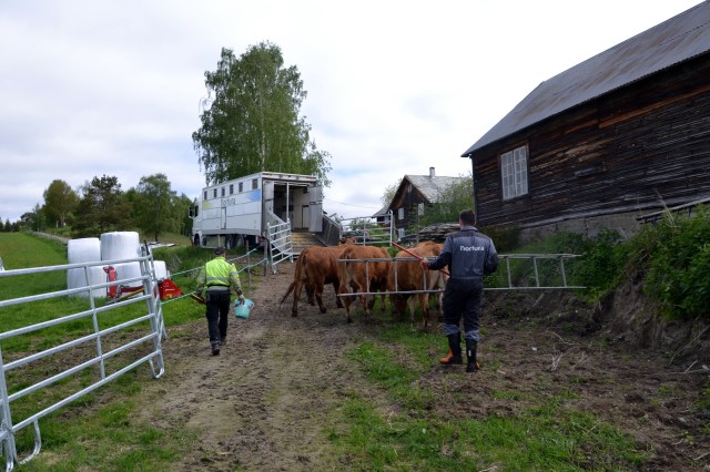 Vi vurderte frem og tilbake om vi skulle gå med dyra den ene mila opp til sætervangen, men endte med å bestille dyrebil og frakte dem på den måten i år, som er første gang. Jeg var vel den som feiget ut og ikke ville gå, da jeg er redd for at dyra kan bli urolige og begynne å løpe ut av flokken. Derfor bil, altså. Dyra ble først delt i to grupper . Ni av kyrne fikk komme inn til oksen Eventyr, og den siste «Mamma Mø» ble værende i en egen innhegning sammen med alle kalvene.