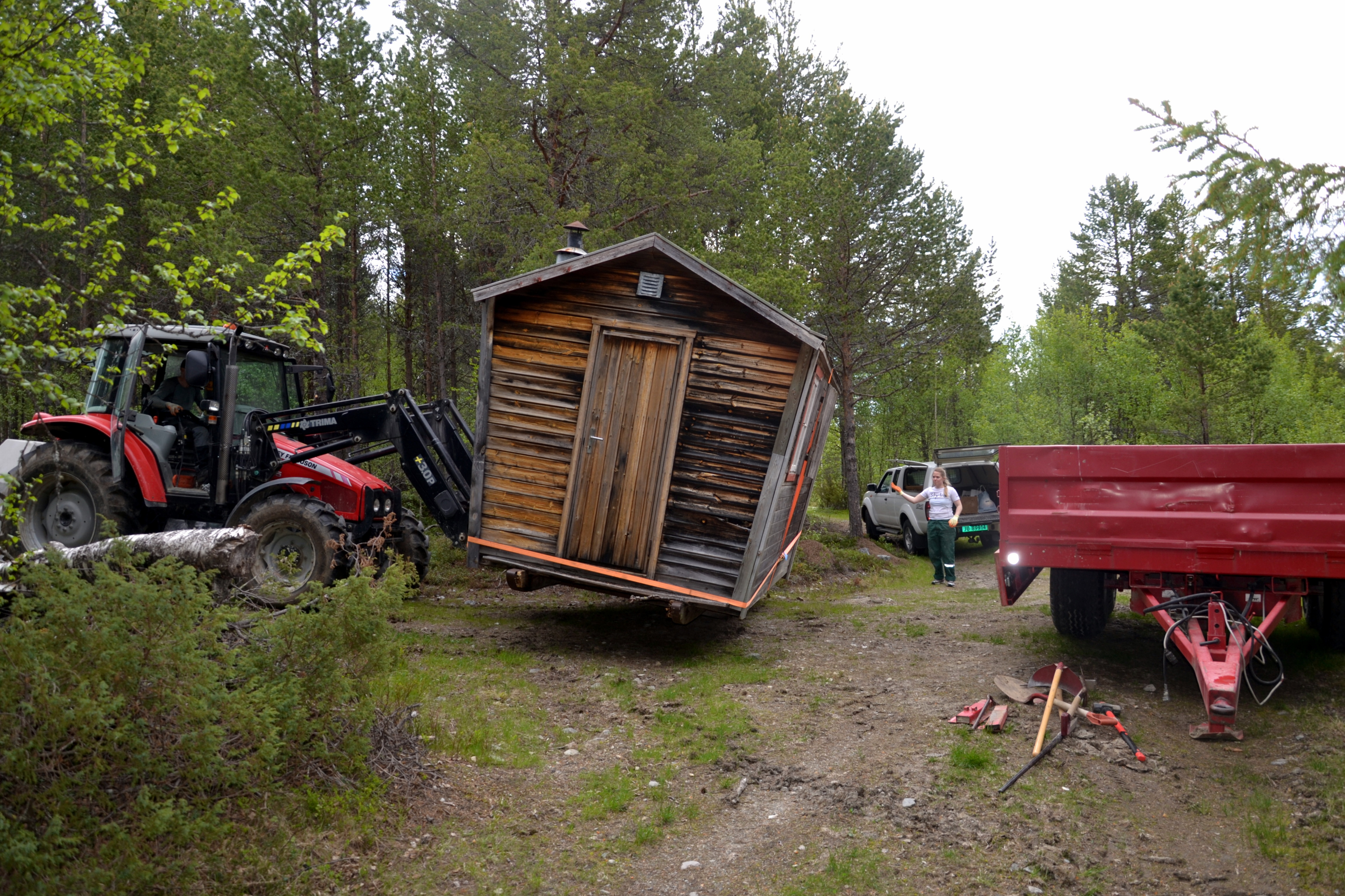 Etter hvert er koia flyttet de rundt femti meterene ned til der hvor tilhengeren er plassert