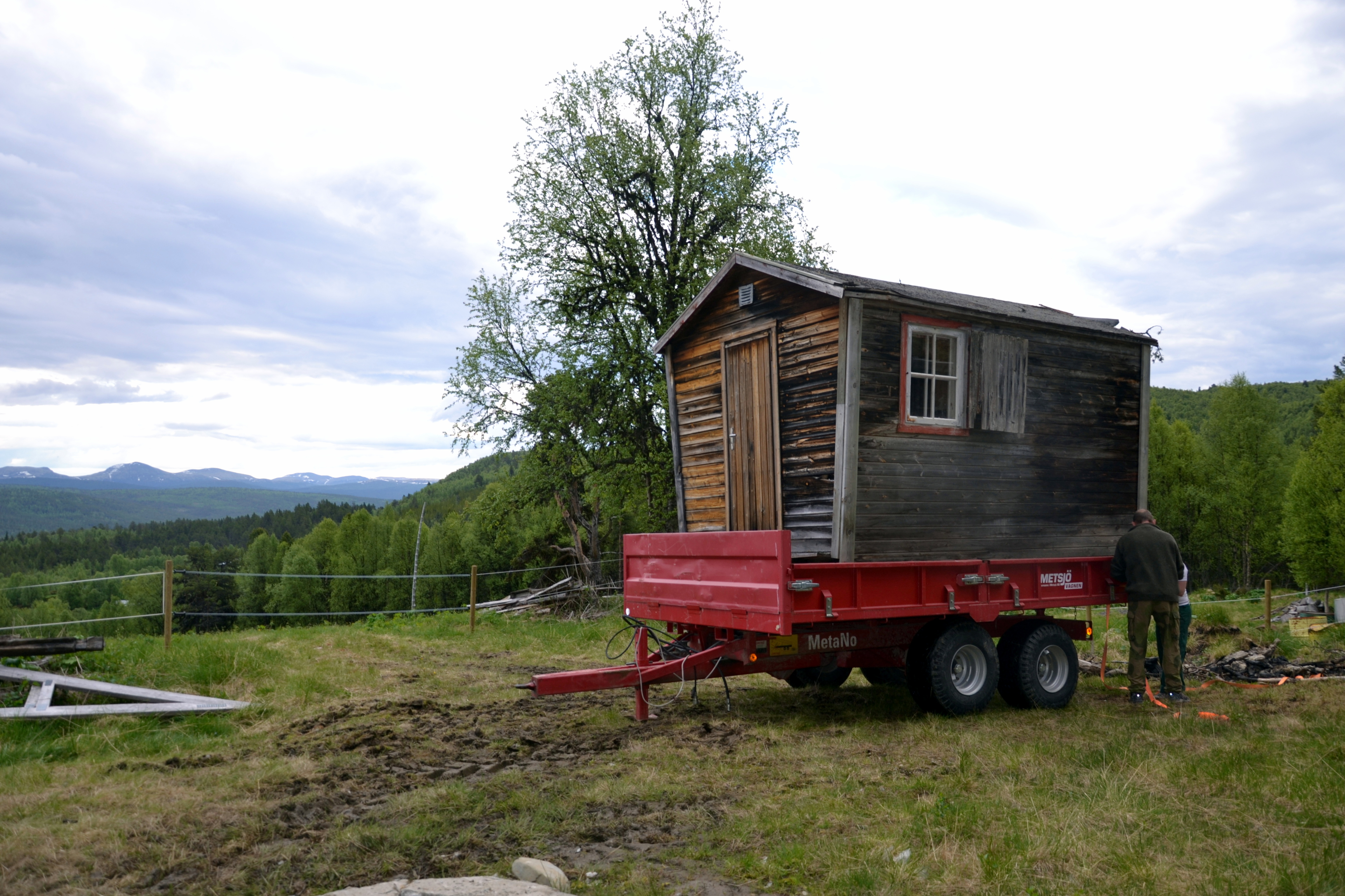 Tilhengeren er plassert på sætertunet, og koblet fra traktoren