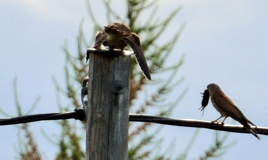 Tårnfalkfar kommer med mus til tårnfalkmor