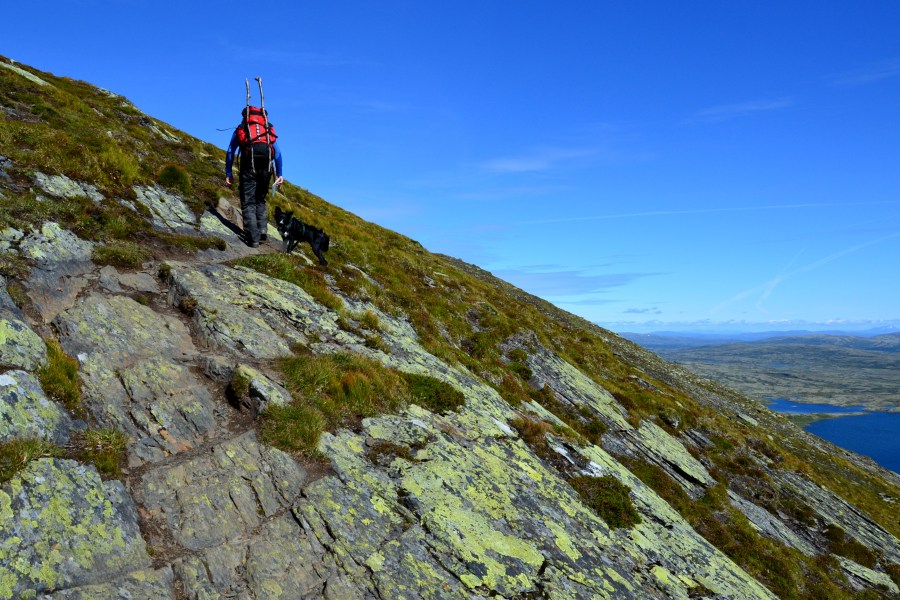 Men stien går fortsatt i gress, men det begynner å bli bratt