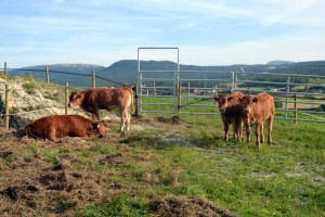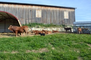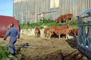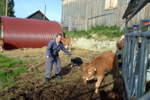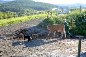 Det skulle ikke være så helt enkelt å få til. Kalvene ser ut til å ha nyttegjort seg godt av sæteroppholdet, og har vokst til store – og tunge- «fjortiser» som ikke var særlig interessert i å dyttes den veien vi ønsket å få dem. Til slutt hadde vi voksne kyr og kalver likevel trygt i forskjellige innhegninger – trodde vi. Morgenen etter hadde imidlertid en kalv kommet seg tilbake til mor! De voksne kyra respekterer elektriske gjerder, men for denne kalven var det visst helt uproblematisk å løpe tvers gjennom trådene – elektrisk eller ikke! Så da var det på’n igjen med å løpe etter kalven og drive den tilbake til de andre små, som nå går sammen med Eventyr, den store oksen. Og nå er de alle innenfor faste gjerder! Neste operasjon blir å skille kvigekalvene fra oksekalvene. Når vi er sikre på at de ikke vil begynne å die igjen, skal alle kvigene, både de små og de store, komme sammen, mens alle oksene skal være atskilt fra dem, på andre siden av fjøset.