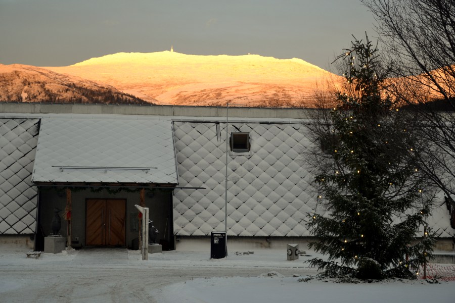 Trontoppen skinner som gull over Aukrustsenteret da vi drar derfra