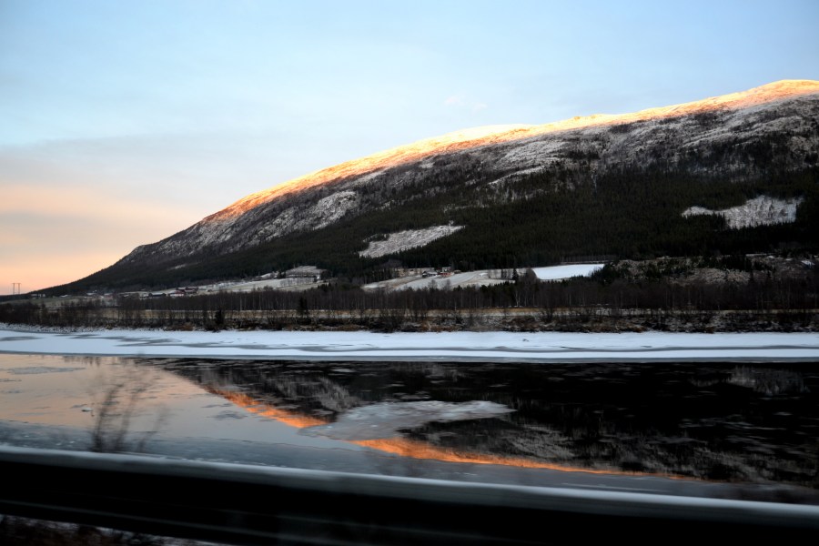 På vei hjem fanger vi dette motivet med svanene på Glomma mens sola så vidt lager en gullstripe på åsen