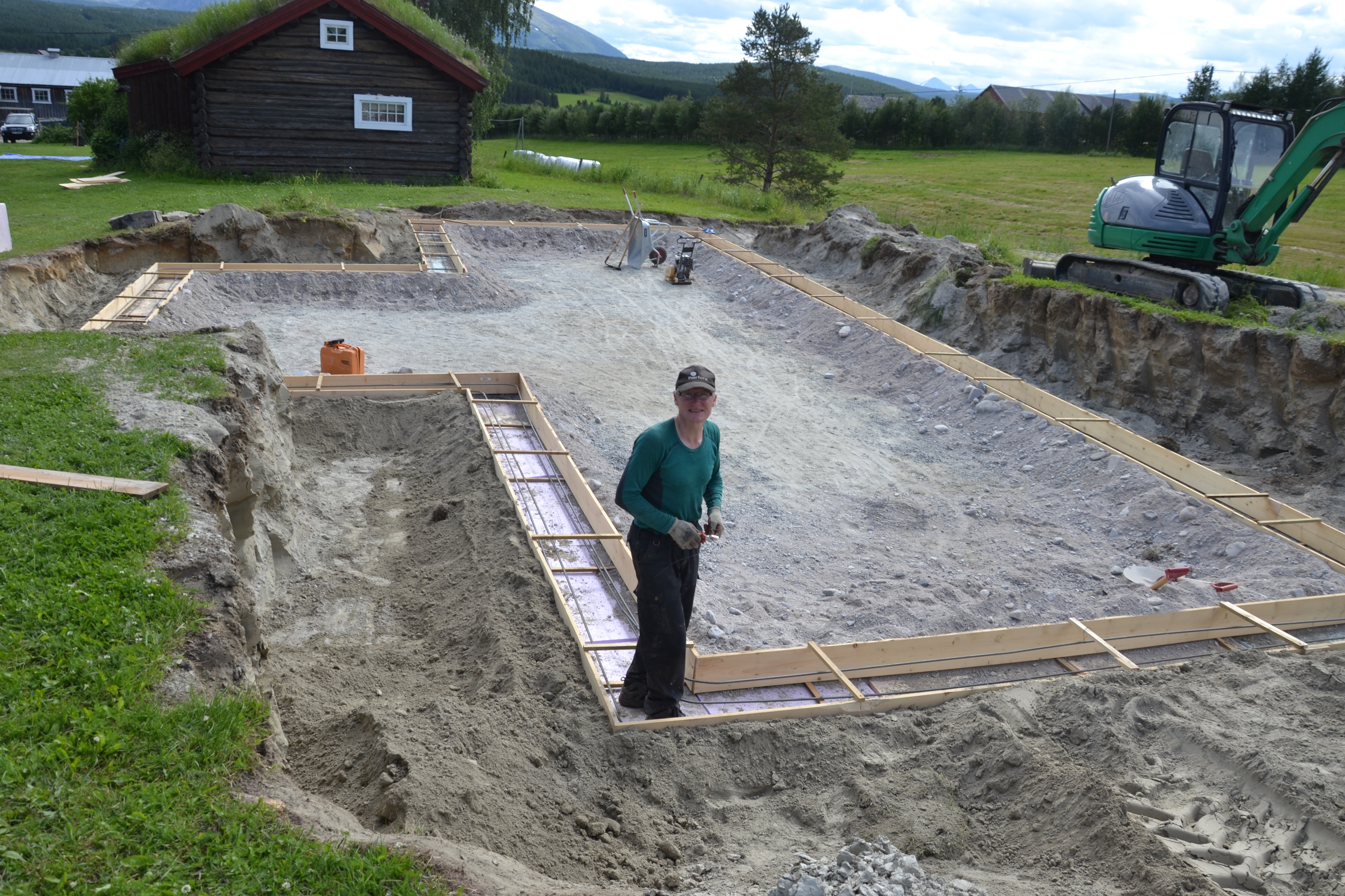 Nytt hus skal opp på gården, og gravearbeidet er foretatt. Vi venter på tømrerne som skal sette opp den gamle tømmerbygningen, kaffekvernhuset.