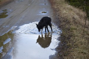 - Etter regnværet i helga er det blitt store vanndammer i veien vår – kjempeflott, syns Bjørk!