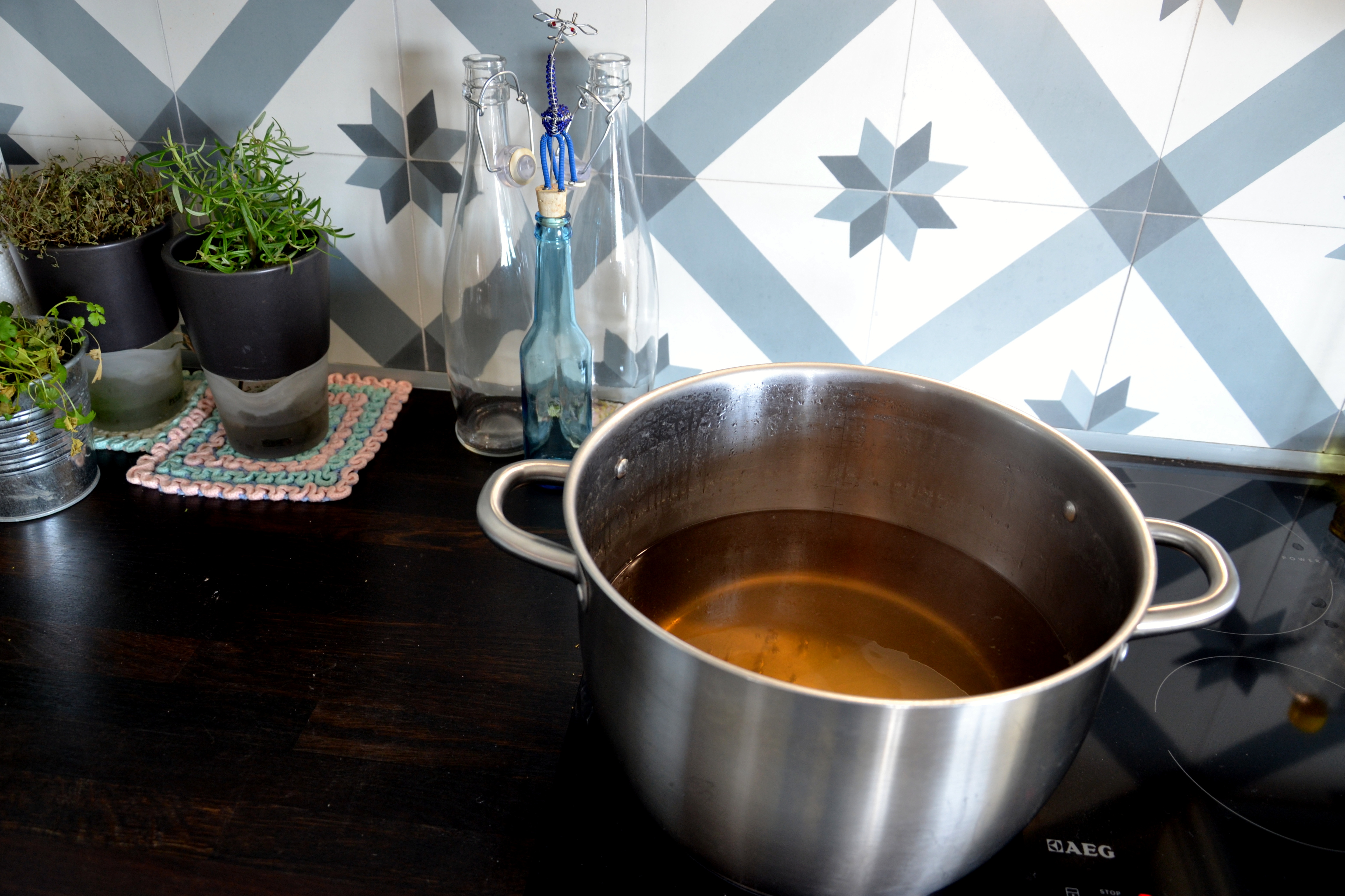 Noen timer senere har saften blitt gylden og fin – og er redusert til under halv mengde