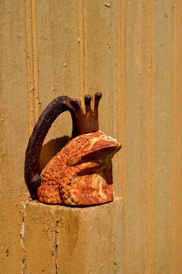 Frosk med krone sitter på veggen utenfor