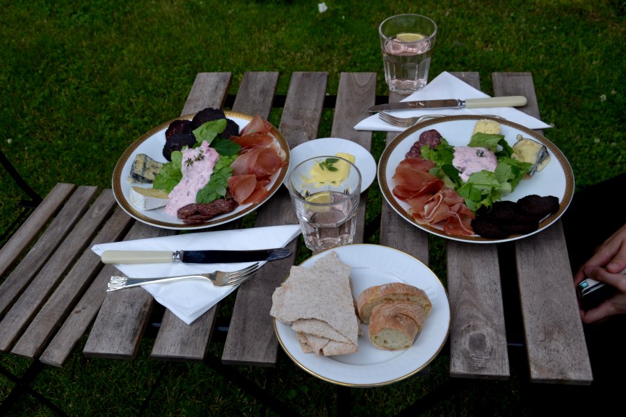 Deilig spekemat med tyttebærrømme, hjemmebakt brød og herlig rabarbradrikke!