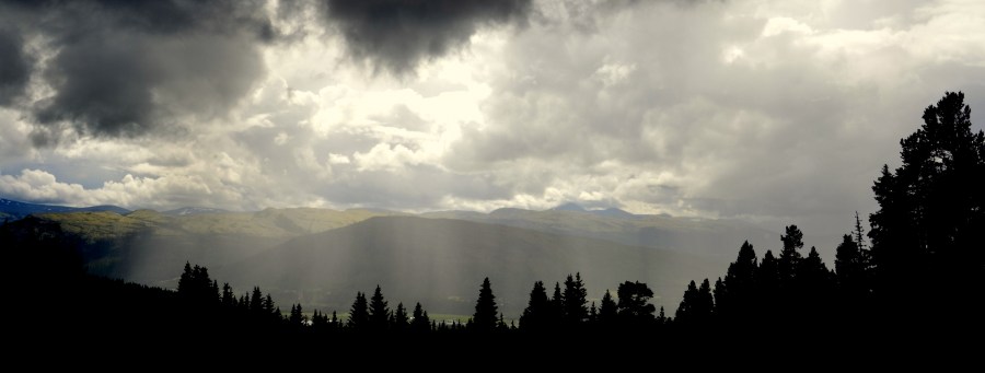 Utsikt mot Alvdal Vestfjell. Denne dagen var det bygevær, med både sol og regn på en gang