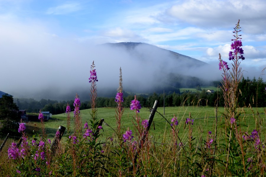 Tronfjell er innhyllet i tåka, men sola er på vei og jager den bort