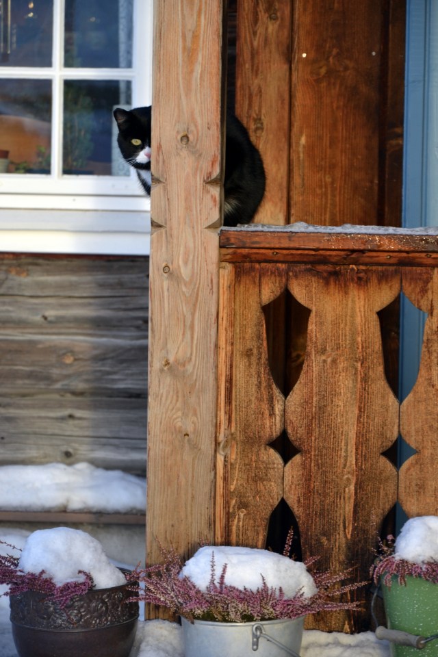 - Pusen Gudleik venter på at noen skal åpne døra så han kan få komme inn og varme potene