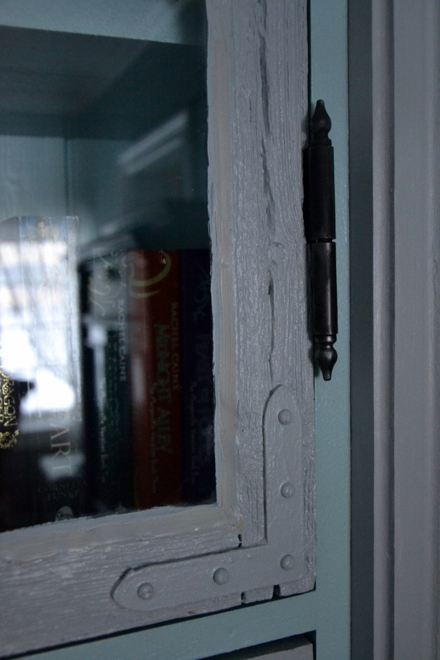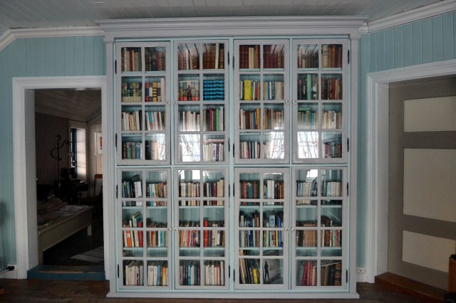 Vi har fortsatt mange flyttekasser stående på loftet. Det er nå rundt fem år siden de første kassene ble pakket ned, og noen av dem er vi litt usikre på innholdet i. Men noen har  vi heldigvis oversikt over og vet de inneholder bøker, og jeg har virkelig sett frem til å pakke dem opp og få dem dit de hører hjemme – i en bokhylle! Familiens handyman har fundert lenge på hvordan han skulle gå frem for å lage hyller som passer. Vi planla tidlig at bøkene skulle plasseres i Klettstua i andre etasje. Jeg ønsket ikke bare en hylle, men helst et bokskap med glassdører. Med diverse innspill fra undertegnede og andre kom han dermed til slutt frem til et bokskap med dører laget av gamle originale vinduer fra huset. Bokskapet ble endelig ferdig like før jul, malt i to farger og med de gamle glassdørene i front.