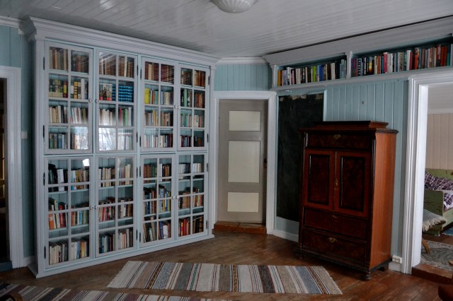 Bøker ble hentet ned fra loftet og plassert i skapet. Men akk, fortsatt var det flere kasser igjen med bøker som ikke fikk plass i skapet. Javel, da lager vi en hylle over døra til Anne Marit-rommet (min mors gamle jenterom). I går ble hylla ferdig malt, og i dag ble også den fylt med bøker. Det ble imidlertid ikke plass til alle bøkene, det trengs enda mer bokplass. Tankeprosessen er allerede i gang, både hos snekker’n og meg om hvordan vi skal få til enda flere hyller. Men foreløpig er vi fornøyde med det som er på plass i Klettstua, eller vårt lille bibliotek.