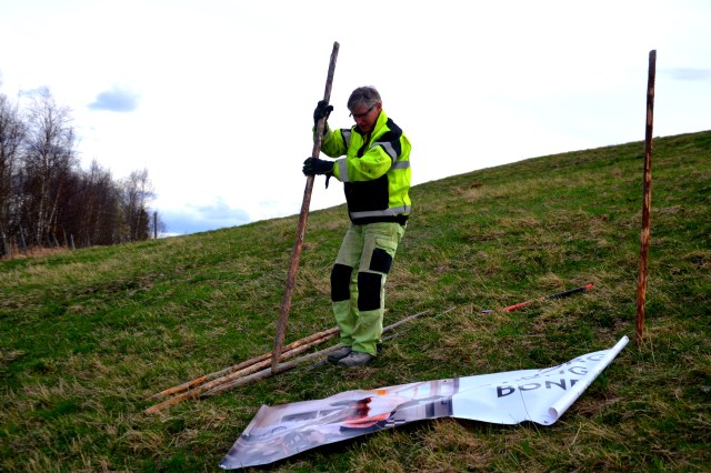 Senere på kvelden, etter at et godt måltid var inntatt på en av Tynsets restauranter, ble finklærne tatt av for andre gang, og arbeidsdressene tatt på igjen. Men denne gangen skulle vi bare finne frem noen staur og en plakat og sette opp godt synlig for trafikken som passerer forbi på riksveien nedenfor Storeggen.