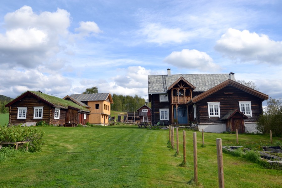 Fra tunet. I bakgrunnen kommer garasjebygget som for tida er under oppføring. Kaffekvernhuset til venstre bak sommerstua.