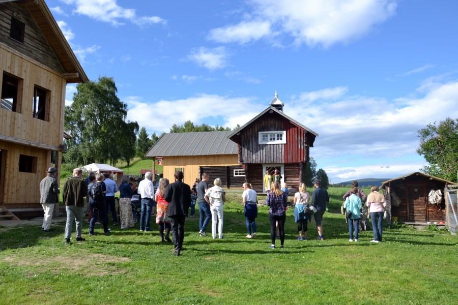 Stabbursklokka har kimt og vertskapet ønsker velkommen på stabburstrappa. I bakgrunnen ser vi det nye «selskapslokalet»