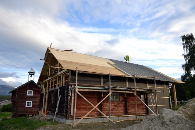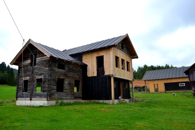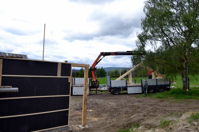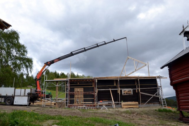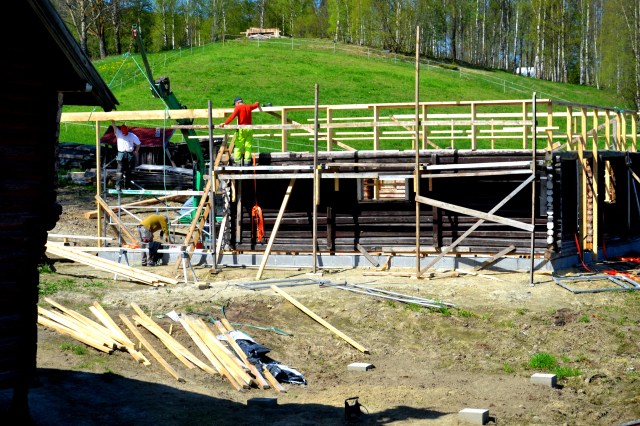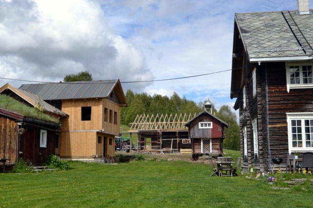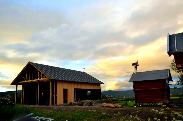I sommer har det skjedd en del bygningsmessig igjen på Storeggen som har stor visuell betydning. I tillegg til det halvferdige kaffekvernhuset, har vi fått satt opp et nytt bygg helt øverst på tunet. Det skal brukes til å huse traktor og annet utstyr, men skal også isoleres og være et sted hvor det kan være mulig å jobbe selv om minusgradene er mange. Huset er delvis laget av et gammelt tømret kufjøs som har stått på Auma, noen kilometer sør for oss. Det ble ikke tatt helt fra hverandre, men kom som et moderne «modulhus» i tre deler. Deretter ble det forlenget og forhøyet med stavlaft og satt på tak, og dermed fikk vi et flott og praktisk bygg som passer godt inn i stilen på resten av gårdstunet. Som vanlig ble arbeidet utført av Svein Olav og hans menn, sammen med vår egen bonde.