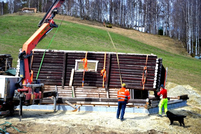- Men så skjer det noe….Garsjen/verkstedbygget kommer svevende i biter