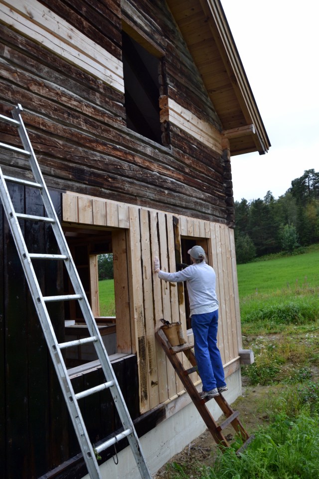 Jeg så ikke akkurat frem til dette arbeidet. Siden vi tjærebredde tilbygget og inngangspartiet på hovedhuset for noen år siden, visste jeg hva vi gikk til. Men her var det bare å skride til verket og få jobben gjort. Med hjelp fra yngste datter i huset, gikk det unna i en fei. Vi var begge temmelig støle og godt innsmurte med tjære hver dag da vi avsluttet for kvelden, og tjærelukten fulgte oss lenge. Men vi ble ferdige og fornøyde med resultatet. Noe gjenstår dog – for vi er avhengig av annet hjelpemiddel i tillegg til stige (les traktorskuffe) for å nå opp til det høyeste. Og traktoren var dessverre opptatt på annet hold, så det får vente til jordarbeidet er unnagjort for i år.