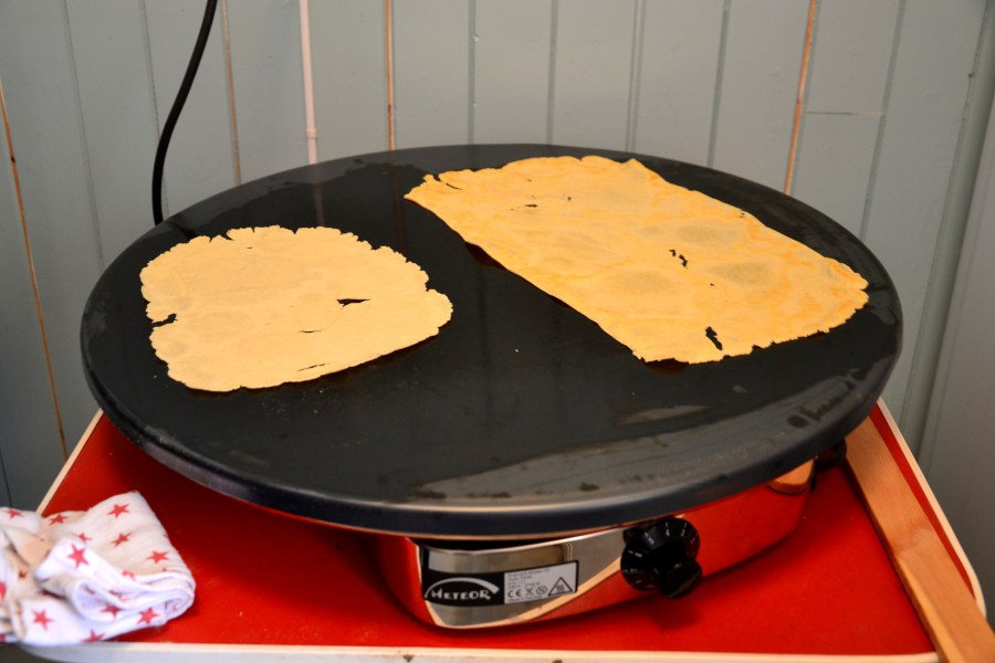 Vi justerer temperaturen på takka litt opp og ned mellom tre og fire. Noen leiver er såpass små at vi kan steke to om gangen. Det er fint, for fort går det ikke!
