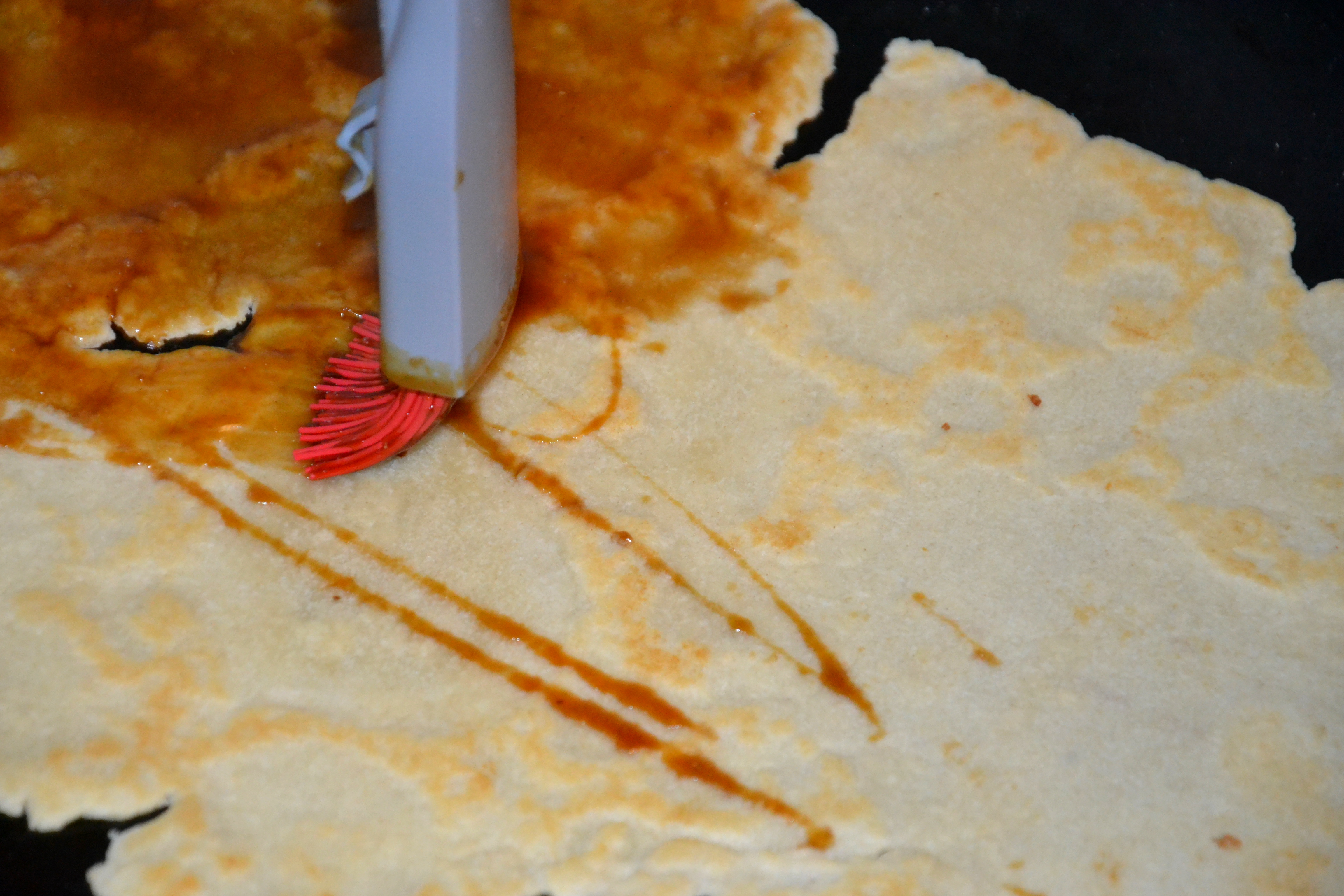 Etter å ha stekt litt på begge sider, smøres sirupsblandingen på.