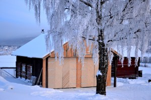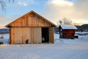 Siste nytt fra Storeggen er at garasjen er blitt lukket med dør på sideveggen og to store porter foran. Oppe på loftet er det en stor åpning over disse portene, slik at det er mulig å laste inn store ting. På baksiden er det en trapp på utsiden av huset, som ender opp i en liten, lav dør på toppen. Til sommeren blir det nok en runde med tjærebreing av den sist oppsatte veggen. Hvordan portene og dørene blir til slutt, er foreløpig ikke bestemt. Huset skal isoleres og tas i bruk også som verksted, men foreløpig ligger det lenger fremme i tid, da det er et annet hus, kaffekvernhuset, som står foran i prioriteringslista vår. Garasjebygget har endret karakter etter den store festen i sommer, da det var festlokale for noen og seksti mennesker!