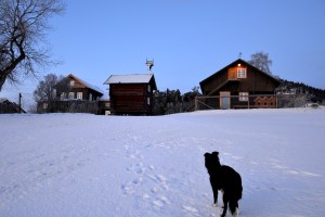 - Bjørk betrakter hjemmet sitt – hundegården på baksiden av garasjen. Over hundegården ses den lange trappa opp til garasjeloftet.