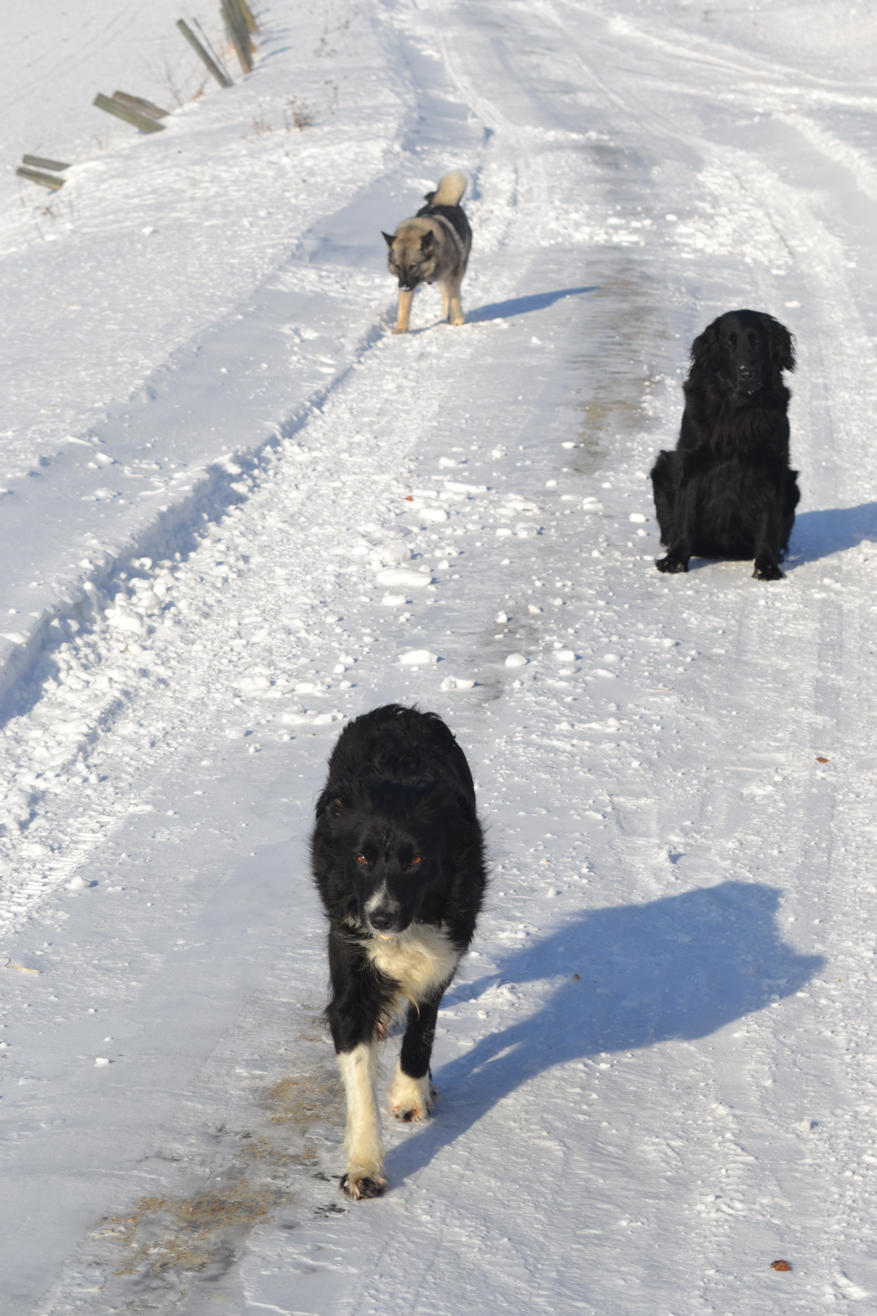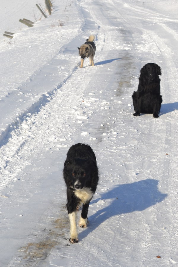 Etter endt arbeidsøkt er det tid for en liten tur med alle tre hundene, Bjørk, Ella og Birka.