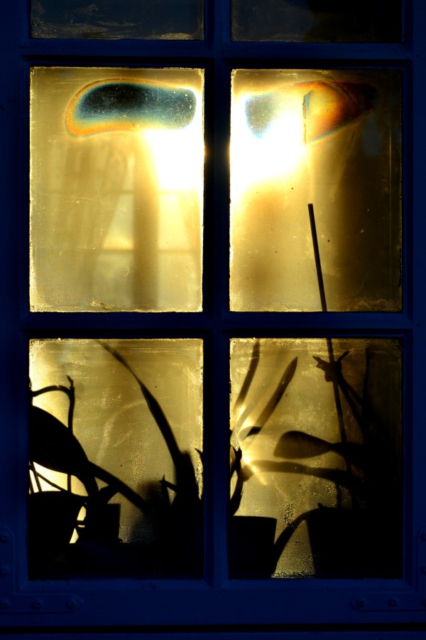 Sol gjennom rommet med morgendugg på rutene