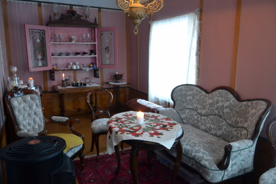Vi inntok etter hvert denne nydelige salongen. Her er det et must å drikke kaffen av tynneste porselen. Den smakte fortreffelig sammen med vertinnens sju herlige kakeslag!