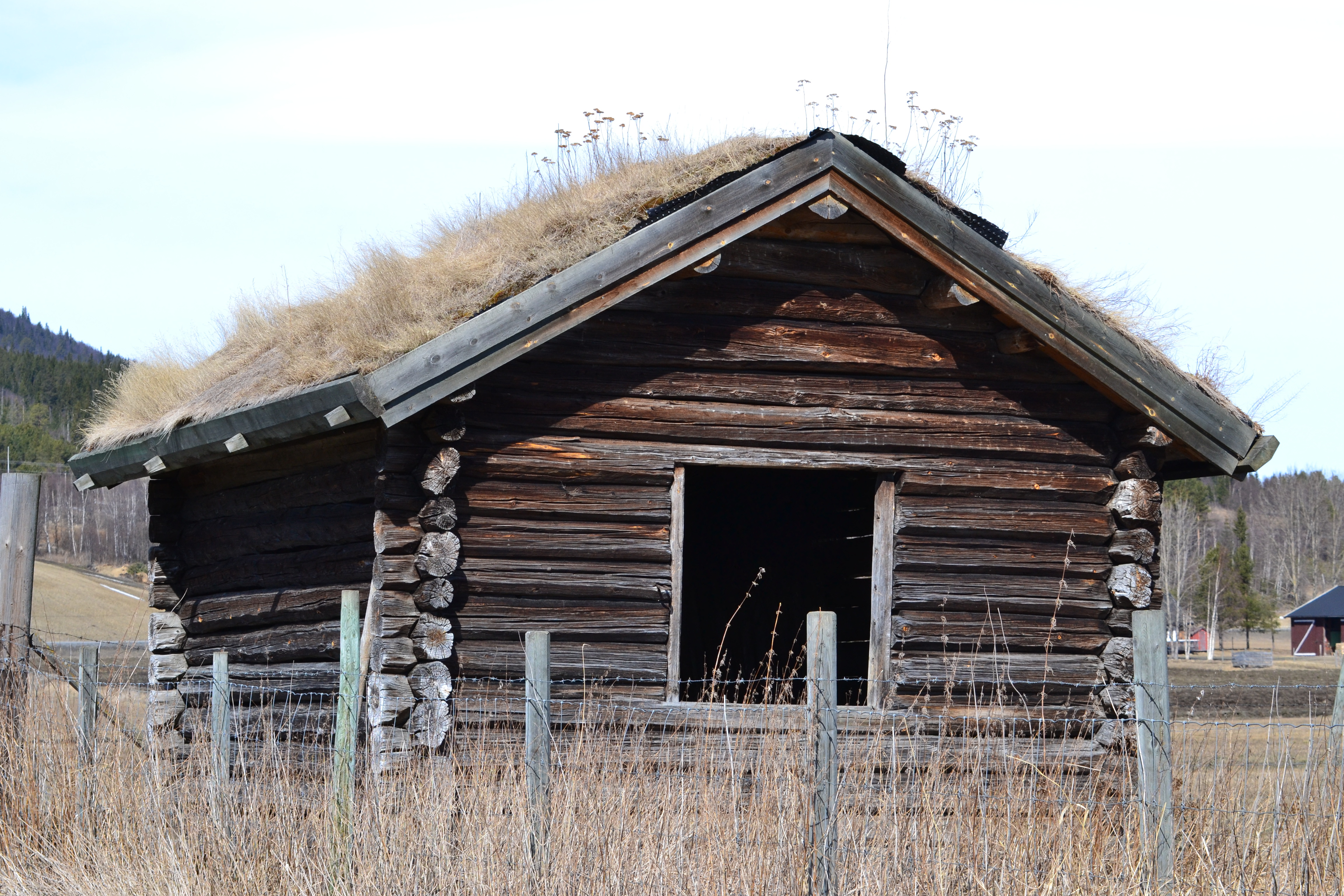 Denne vesle løa er restaurert og er et fint gammelt kulturminne på jordet nedenfor gården vår