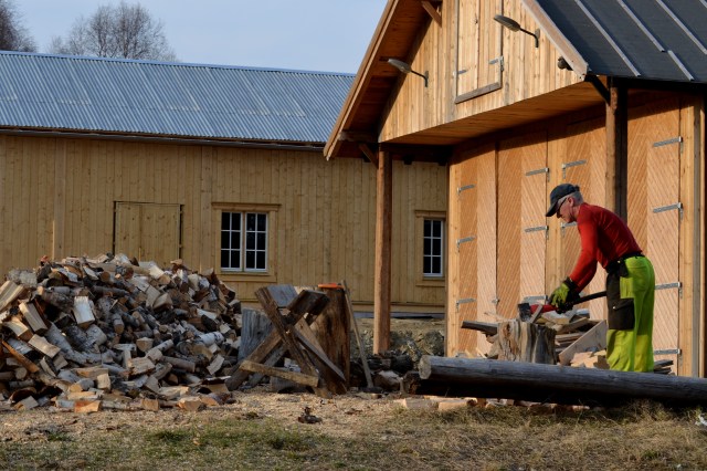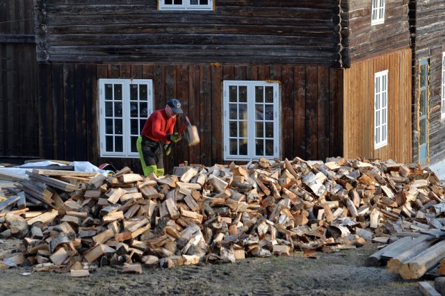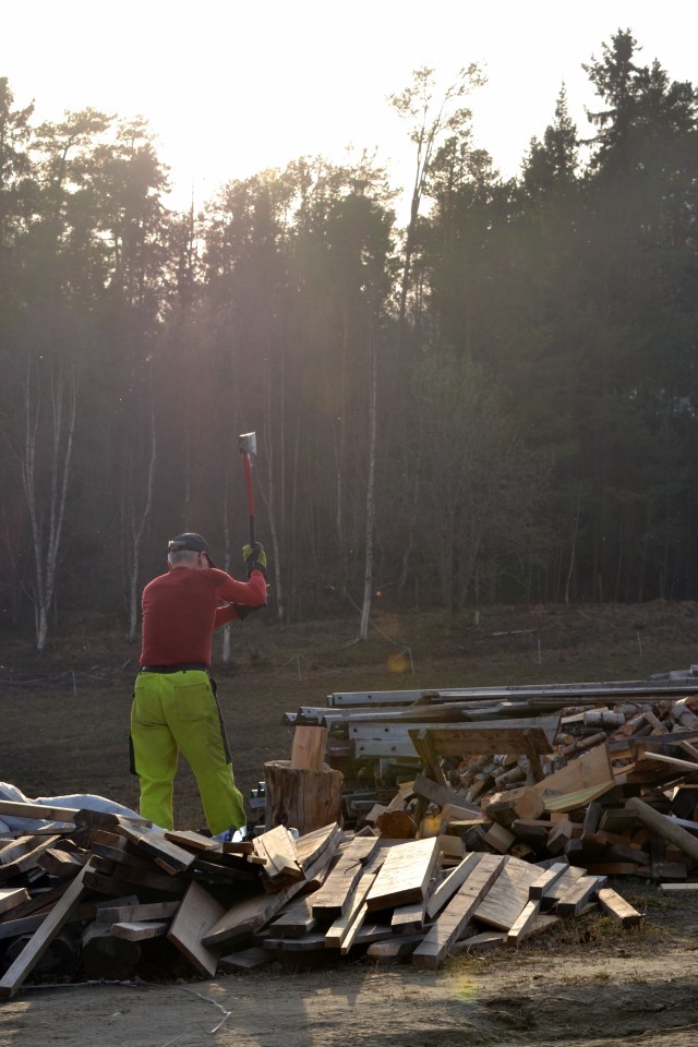 Nykløvd ved lukter så godt! Noen dager etter påske, altså i slutten av april, var bonden her i full gang med å gjøre i stand neste vinters ved. For en ting som er sikkert er det at det, i hvert fall her hos oss, kommer en ny vinter med frost og kulde – selv i disse skumle varme, klimaendringstider. Nå er veden berga og det gjenstår bare å stable den i det nye vedskjulet. Det må bare få et støpt gulv først.