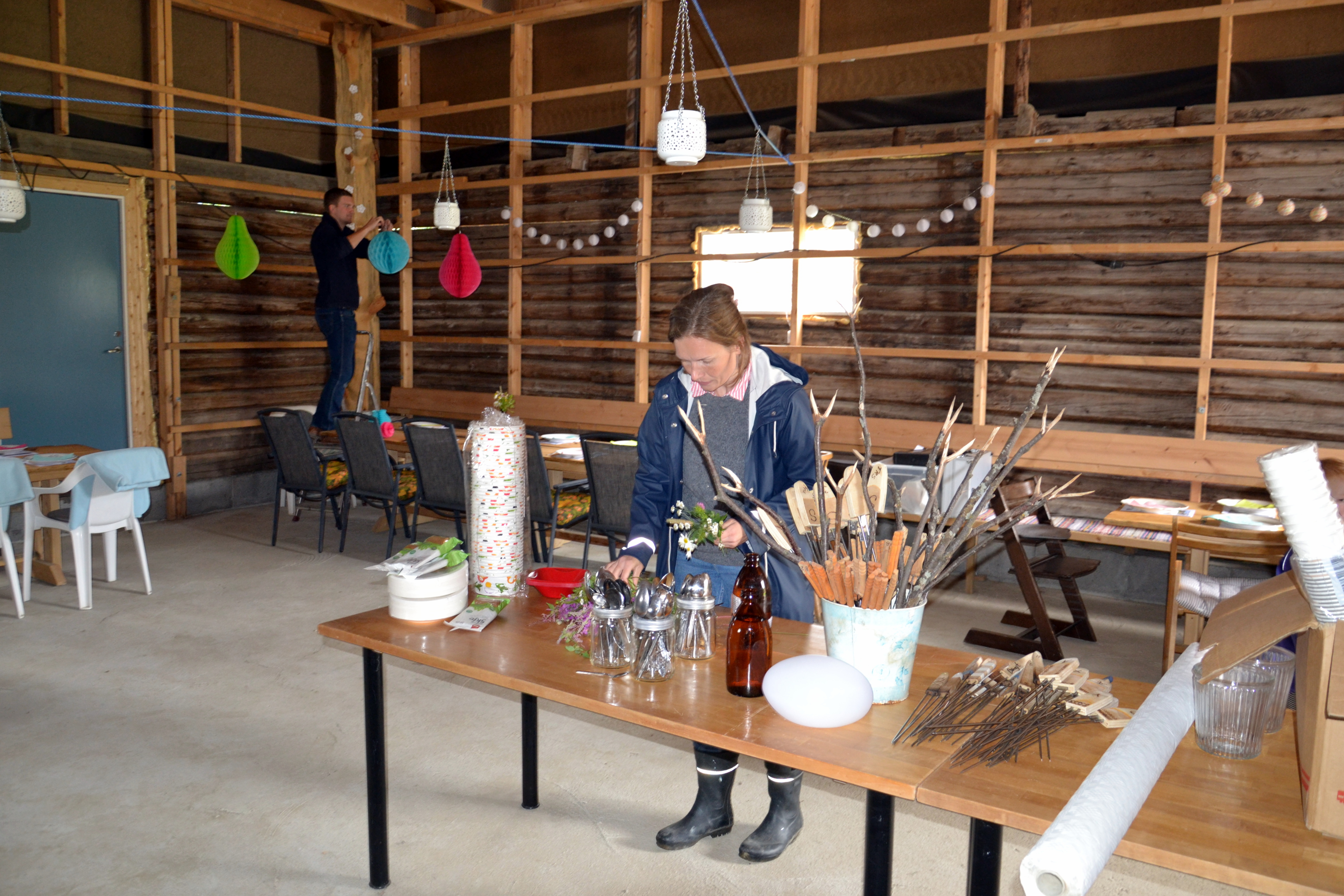 Hege plukker blomster og setter ut på bordene, mens Fabian pynter vegger.