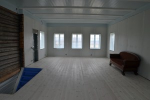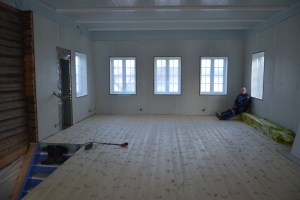 I andre etasje kommer selve drømmesalen! Det er ett stort rom som består av hele midtstykket, eller oppstua, på kaffekverna. Der håper vi at det kan arrangeres både det ene og det andre – det skal bli plass til mange. Her er veggene klargjort til tapetsering, og de skal få noe utsmykninger i tillegg (den som følger med, får se). En liten del av veggene skal også her forbli rå tømmervegg.