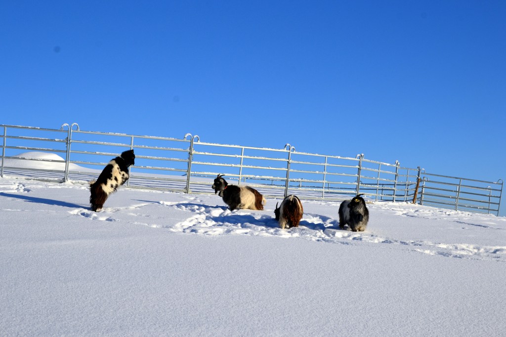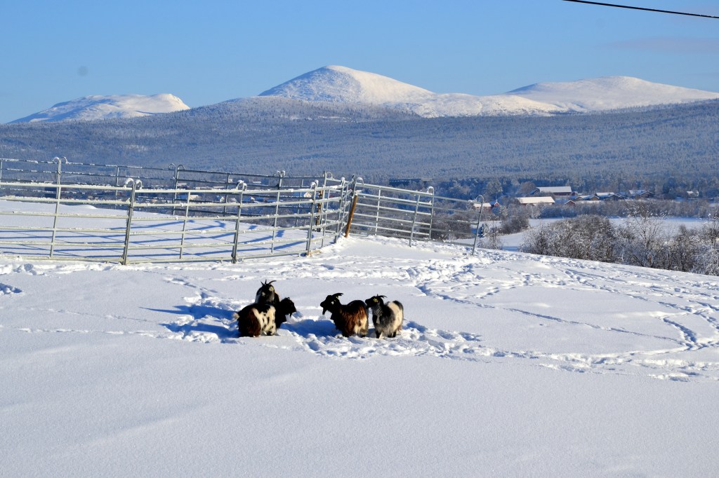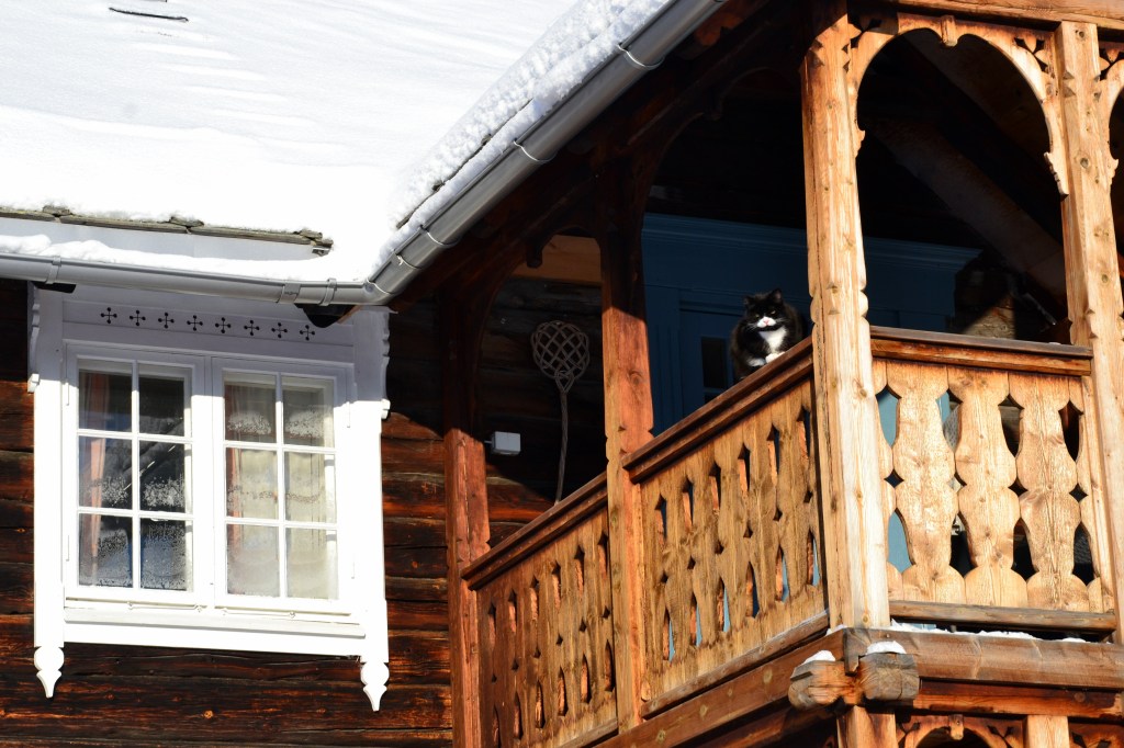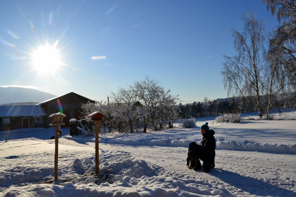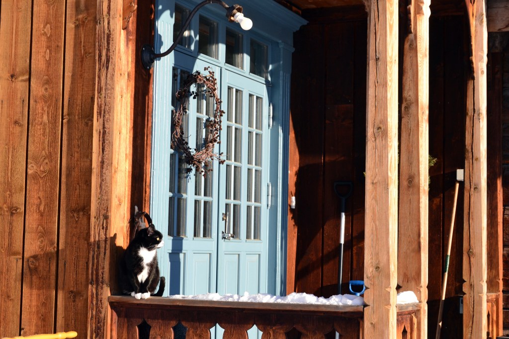 Nå har det imidlertid vart i mange uker med grader ned mot eller under tretti og vi begynner å bli litt lei. Jeg bruker å si at det er viktig å ta vinteren i bruk for at den ikke skal bli for vanskelig å komme gjennom, men nå er det rett og slett for kaldt for å være ute særlig lenge om gangen for eksempel for å gå på ski. Så hvordan skal vi da kunne ta den i bruk? Jo, på med de to stillongsene under boblebuksa, ullgenser og dunjakke, skjerf over nesa og lue på toppen, i tillegg til et par gode votter – og kamera over skulderen. For det er jo så vakkert! Det er ikke grenser for alle de nydelige motivene som bare roper etter å bli foreviget på kameraet. Under diktet av Hans Børli har jeg lagt til noen få av bildene som er tatt fra gården vår i dag. Når jeg har mulighet tar jeg en liten runde med geitene og hundene for at de skal få litt luft. De er ellers også for det meste innendørs når det er så kaldt. Gudleik katt må også ut noen små, korte turer i løpet av dagen. Akkurat i dag kunne vi kjenne sola varme bittelitt, og han så ut til å sette pris på det fra sin yndlingsplass på verandagelenderet.