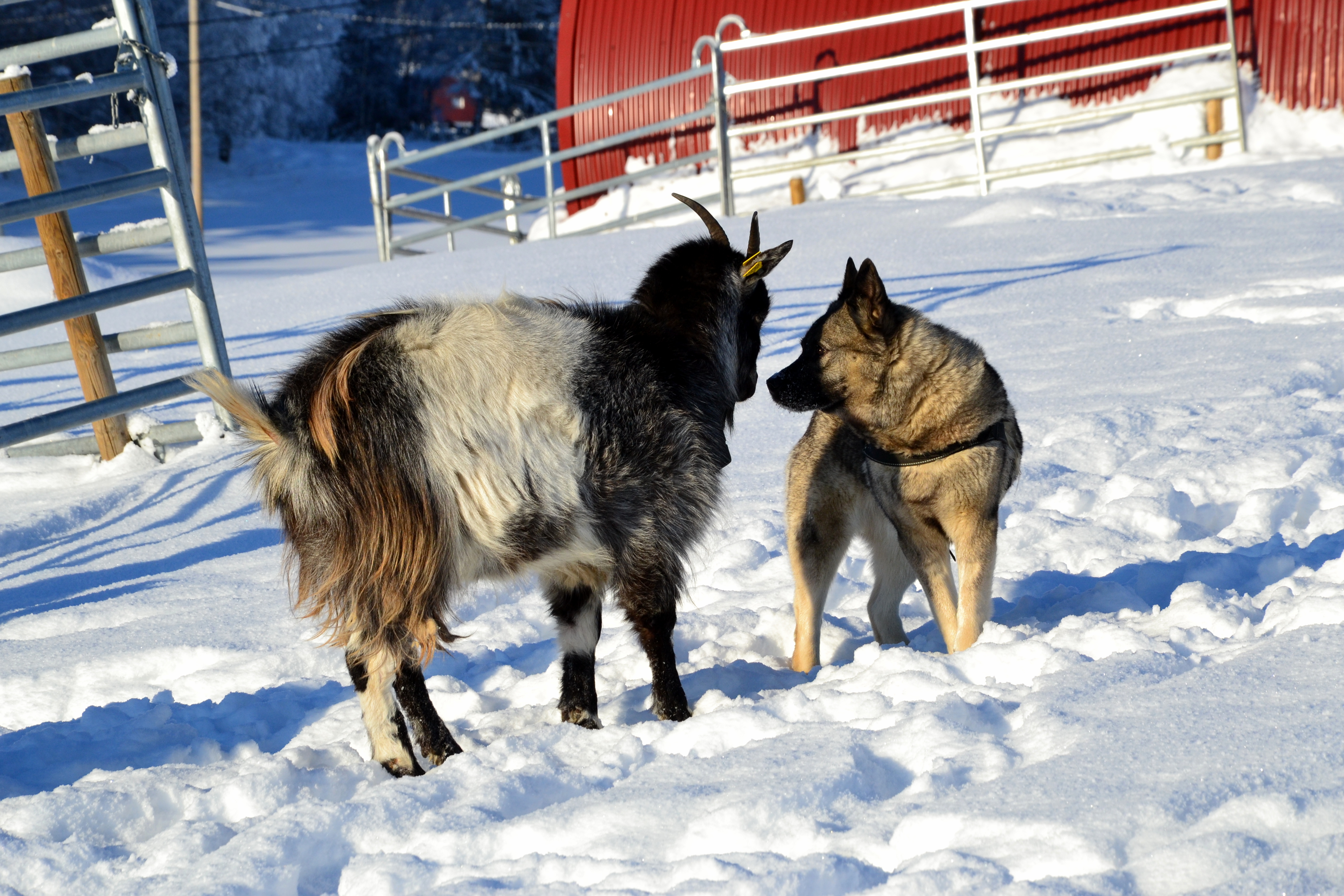 Nå har det imidlertid vart i mange uker med grader ned mot eller under tretti og vi begynner å bli litt lei. Jeg bruker å si at det er viktig å ta vinteren i bruk for at den ikke skal bli for vanskelig å komme gjennom, men nå er det rett og slett for kaldt for å være ute særlig lenge om gangen for eksempel for å gå på ski. Så hvordan skal vi da kunne ta den i bruk? Jo, på med de to stillongsene under boblebuksa, ullgenser og dunjakke, skjerf over nesa og lue på toppen, i tillegg til et par gode votter – og kamera over skulderen. For det er jo så vakkert! Det er ikke grenser for alle de nydelige motivene som bare roper etter å bli foreviget på kameraet. Under diktet av Hans Børli har jeg lagt til noen få av bildene som er tatt fra gården vår i dag. Når jeg har mulighet tar jeg en liten runde med geitene og hundene for at de skal få litt luft. De er ellers også for det meste innendørs når det er så kaldt. Gudleik katt må også ut noen små, korte turer i løpet av dagen. Akkurat i dag kunne vi kjenne sola varme bittelitt, og han så ut til å sette pris på det fra sin yndlingsplass på verandagelenderet.