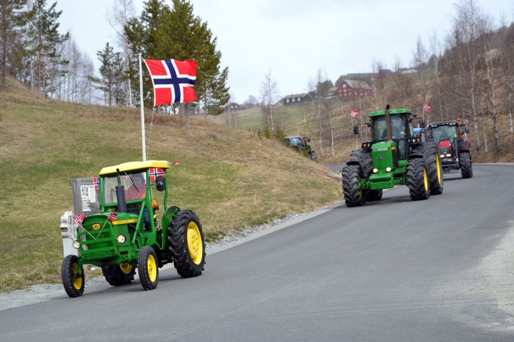 Helt på tampen må jeg nevne at det akkurat nå pågår et stort utbrudd av covid-19 i vår kommune og de nærmeste nabokommunene. Smitten innhentet altså også oss til slutt. Selv er vi friske og lever omtrent som før – bortsett fra større innslag av hjemmekontor og at flere forretninger er stengt. Så håper vi at ingen blir alvorlig syke og at smitten blir stoppet, både her og over alt ellers. 17.mai er så godt som avlyst her, kanskje like greit i år, med en forferdelig våt værmelding. Vi setter vår lit til neste år, som forhåpentligvis vil overgå alle tidligere års feiringer! Likevel ønsker vi alle en god 17.mai, her representert med fjorårets alternative tog – traktortoget 🙂