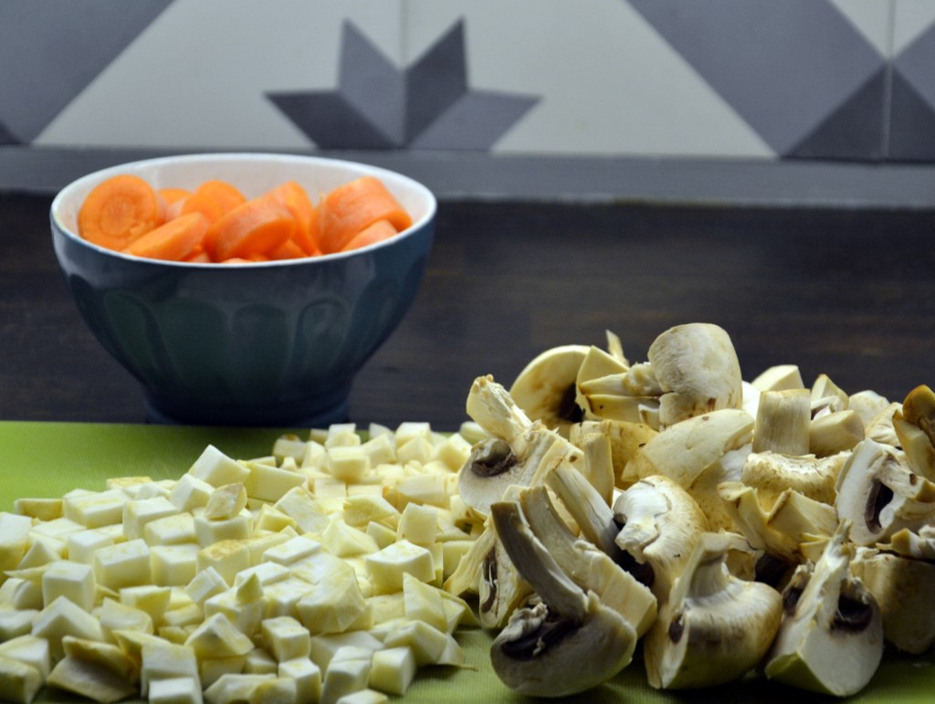Rotgrønnsaker, f.eks.to, tre gulrøtter, en bit kålrot, litt sellerirot, litt persillerot, alt skåret i terninger/biter