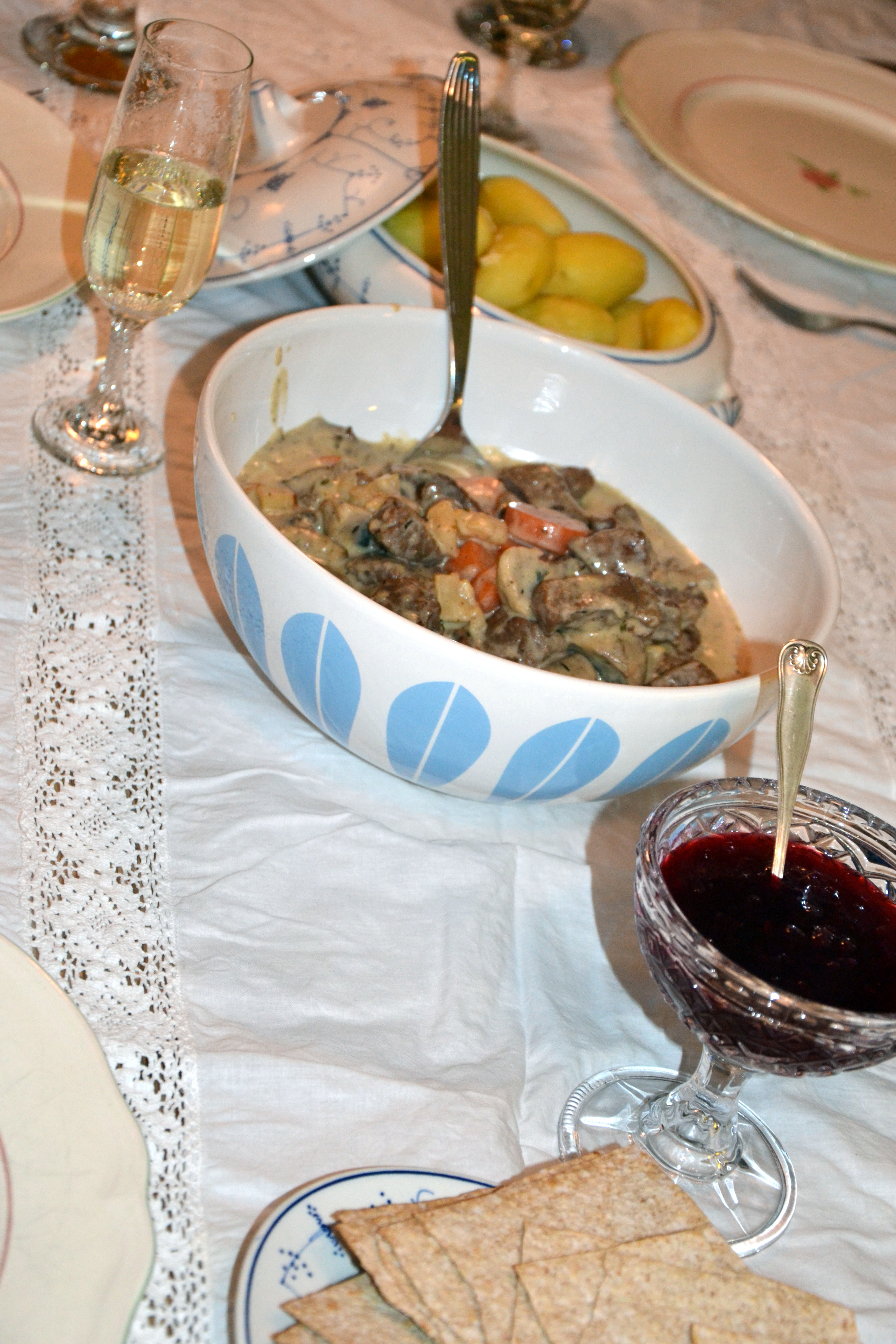 Jeg har overhodet ikke tenkt å begynne som matblogger, men noen spurte om jeg ikke kunne dele noen oppskrifter her på bloggen. Jeg har gjort det fra tid til annen, men det er en god stund siden sist. Siden jeg laget en elggryte til navnefesten for et par uker siden, tenkte jeg det kan passe å legge ut oppskrift på denne i dag. Du kan bruke kjøtt fra storfe eller vilt, etter hva du har tilgang på, eller etter smak. Vi vil selvfølgelig anbefale limousinkjøtt! I vårt område er det flere produsenter av delikatessepoteten mandelpotet, og den passer utmerket til denne retten.