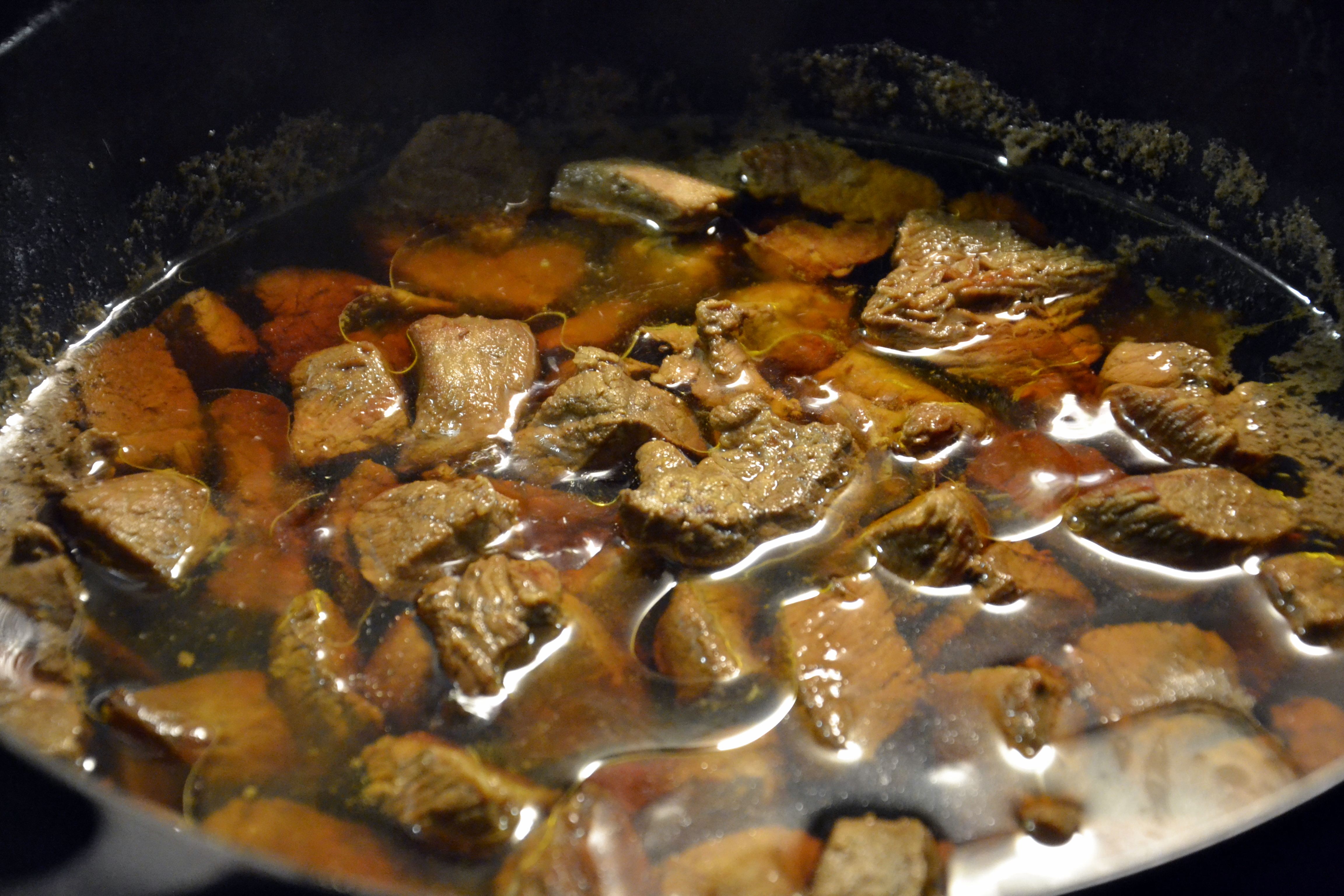 Brun kjøtt-terningene i en jerngryte eller panne. Jeg liker å bruke smør, men du kan også steke i olje. Det er lurt å tørke av bitene før du steker dem, så blir de mest stekt – ikke kokt (!) Og ikke legg alle bitene i gryta på en gang, det kan også føre til at temperaturen ikke blir høy nok til at kjøttet får den gode stekeskorpa vi ønsker. Når alle biter er ferdigstekte, dvs at de har fått en fin stekeskorpe (de skal ikke være gjennomstekte), legger du alt kjøttet tilbake i gryta og heller over vann. Det skal være akkurat så mye vann at det så vidt dekker kjøttet. Ha også i urtene (timian) og de knuste einebærene og la det hele småkoke under lokk til kjøttet er mørt. Det tar opptil to timer, avhengig av størrelse og kvalitet på kjøttet.