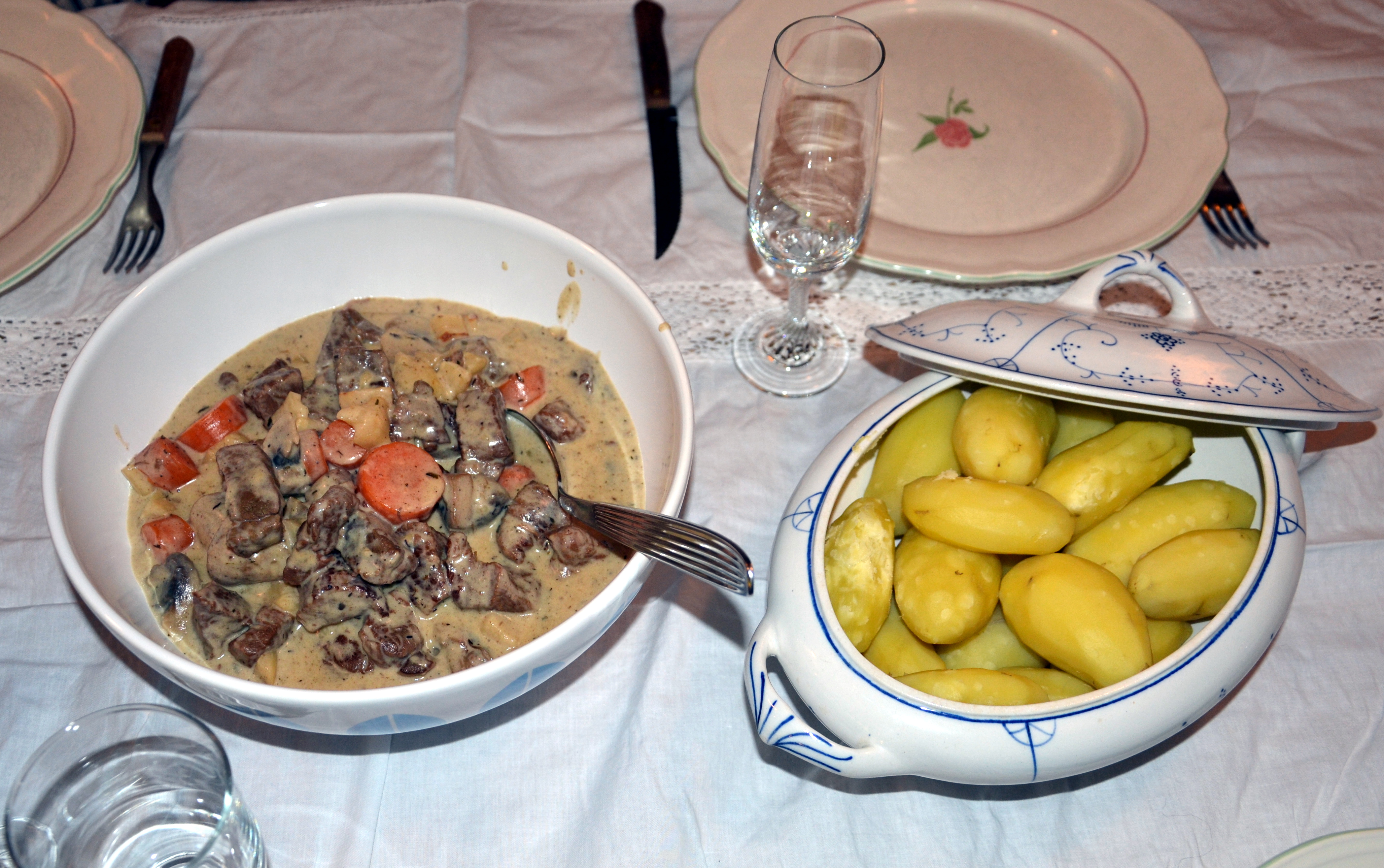 Jeg har overhodet ikke tenkt å begynne som matblogger, men noen spurte om jeg ikke kunne dele noen oppskrifter her på bloggen. Jeg har gjort det fra tid til annen, men det er en god stund siden sist. Siden jeg laget en elggryte til navnefesten for et par uker siden, tenkte jeg det kan passe å legge ut oppskrift på denne i dag. Du kan bruke kjøtt fra storfe eller vilt, etter hva du har tilgang på, eller etter smak. Vi vil selvfølgelig anbefale limousinkjøtt! I vårt område er det flere produsenter av delikatessepoteten mandelpotet, og den passer utmerket til denne retten.