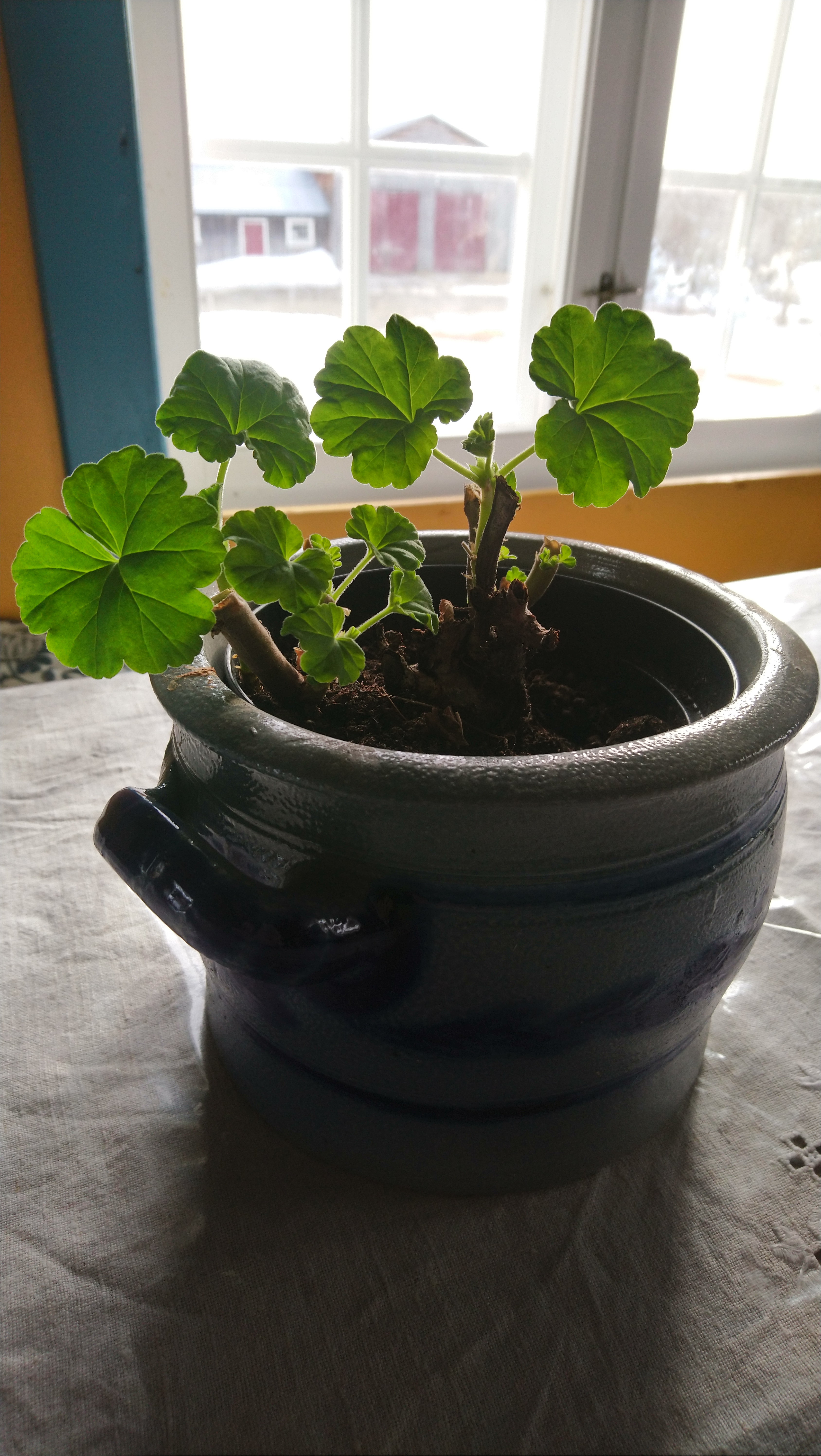 I storstua står pelargoniumplanter som er tatt opp fra vinterdvalen i kjelleren og beskåret. Det spirer allerede nye kraftige blader på de tilsynelatende tørre pinnene. Vi må vente med uteplanter en god stund til, i mellomtida kan vi pynte innendørs mens vi venter på å kunne gå ut og grave i jorda, så frø og sette planter.