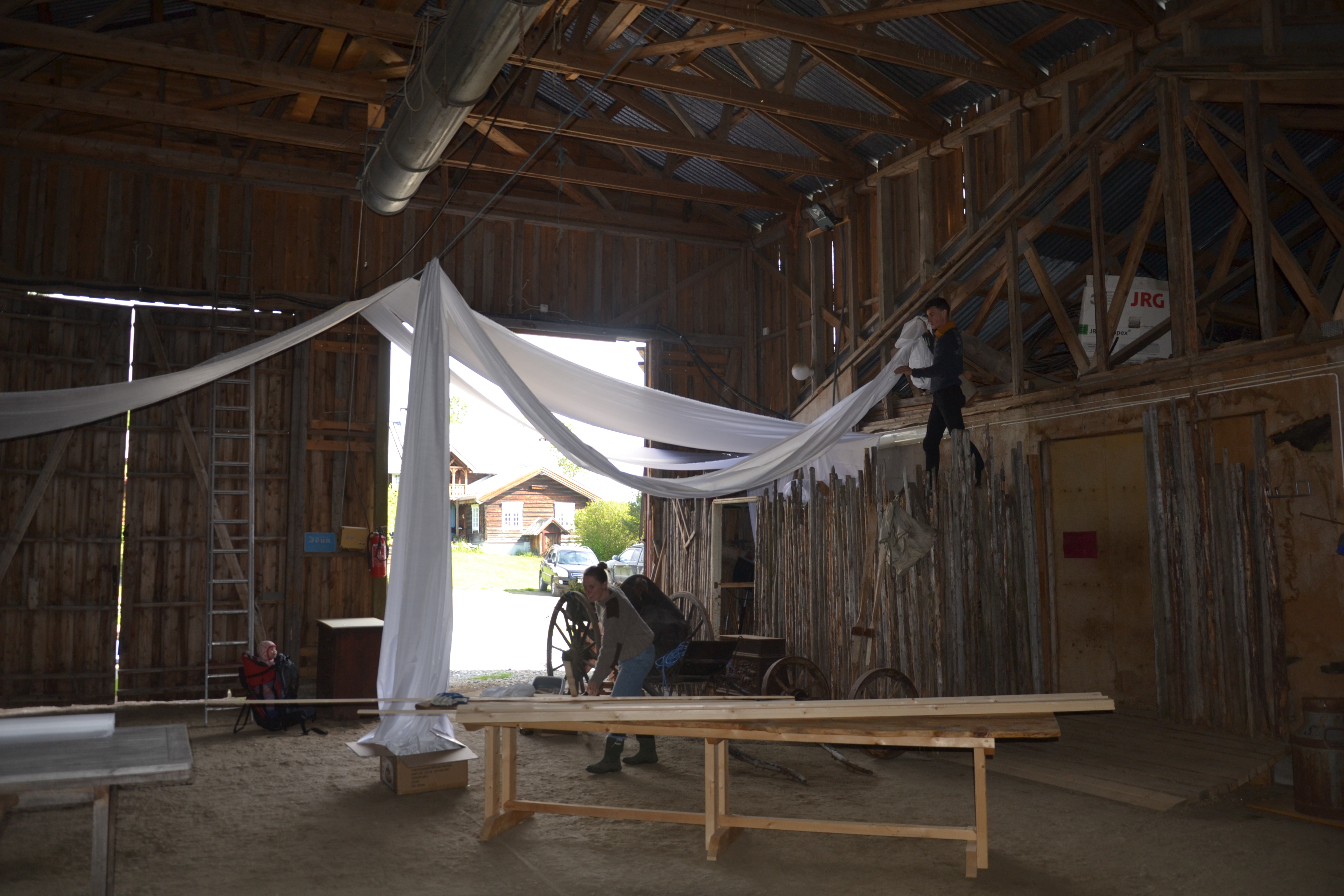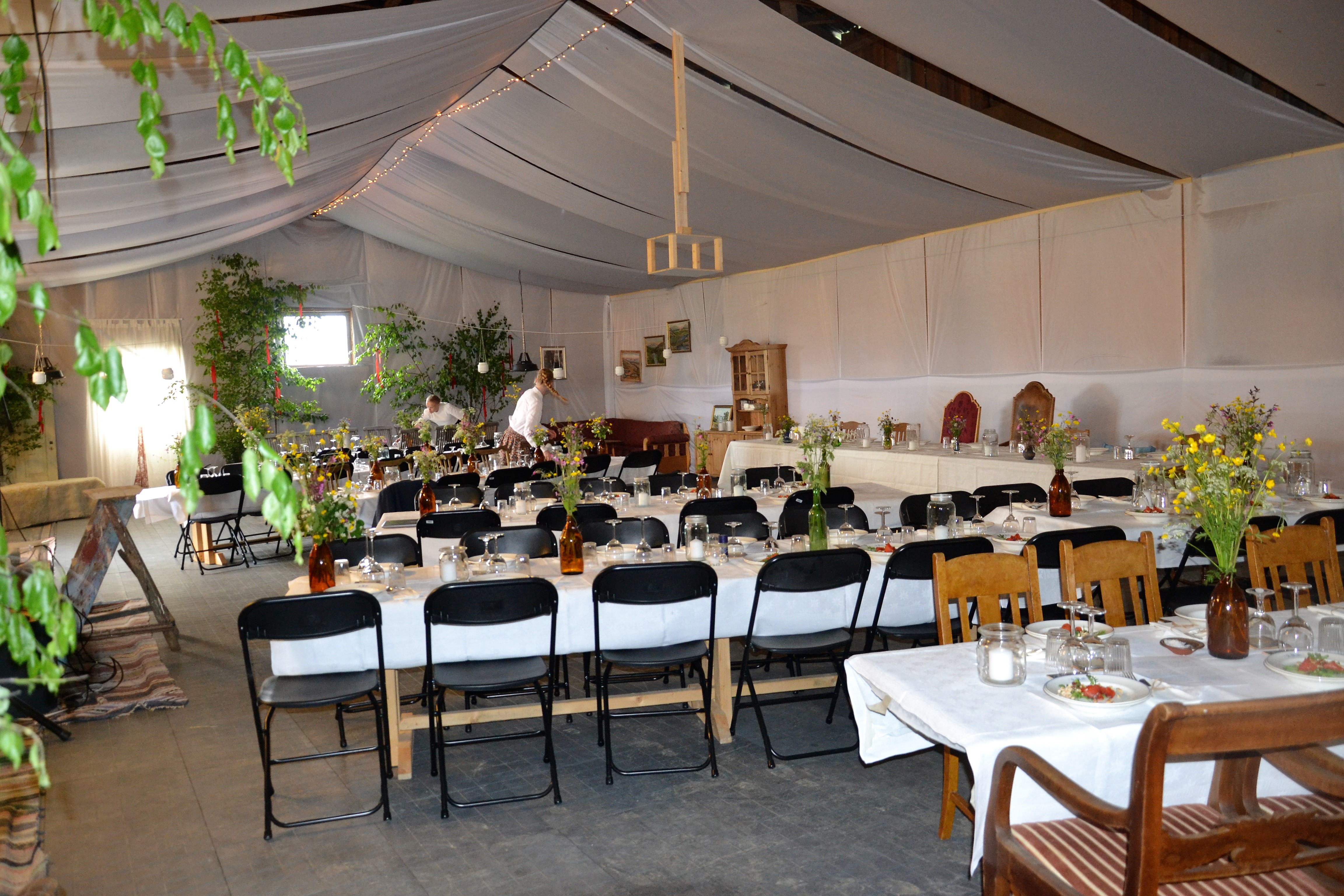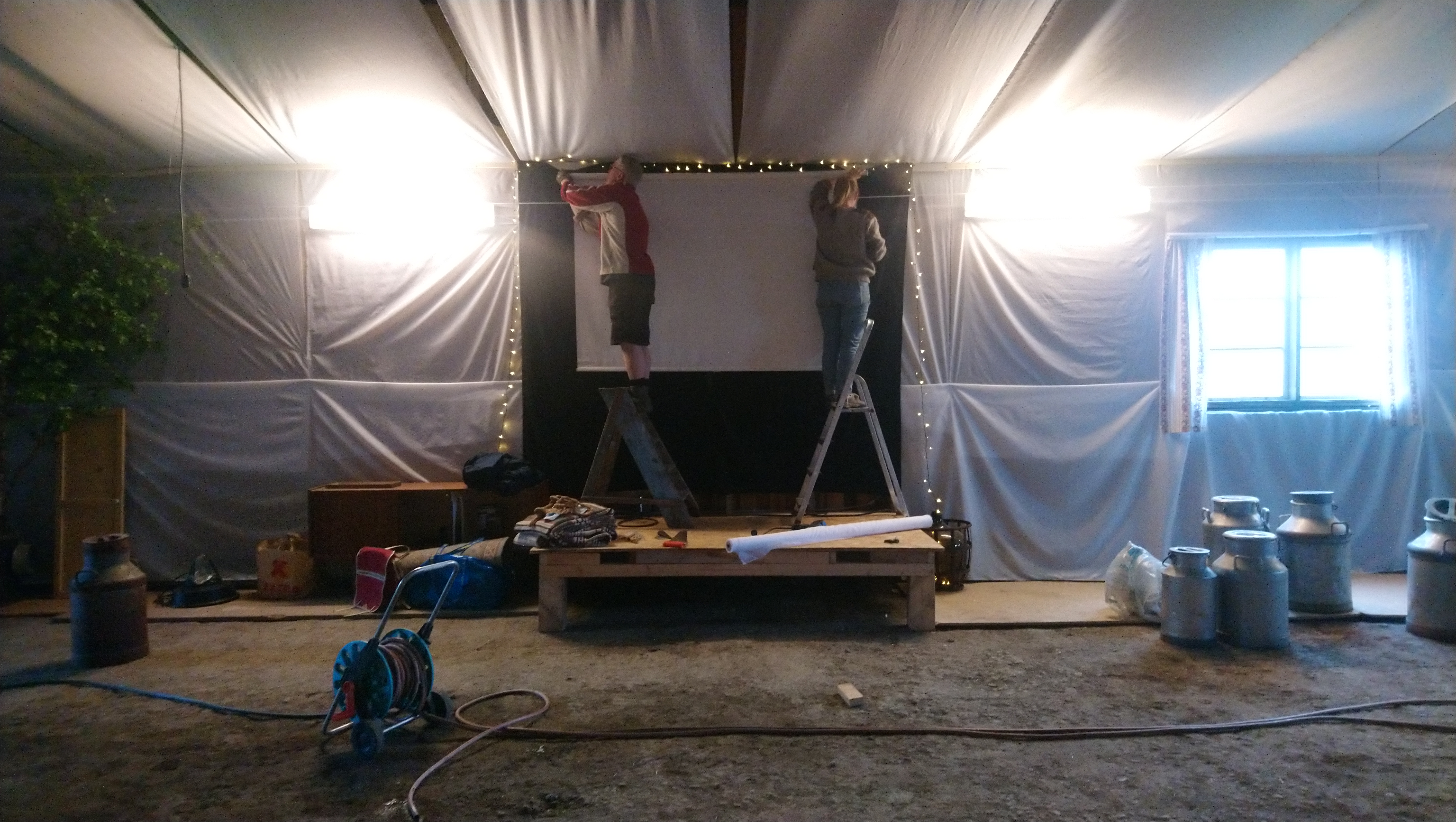 Etter hvert tar det hele form, og vi begynner å se at det vil kunne fungere ganske så bra med bryllupsfest på låven. Vi lager til et ekstra toalett i det gamle geitefjøset, nødutganger merkes og pynt og lys, bilde- lerret og andre ting blir montert opp rundt om i lokalet.