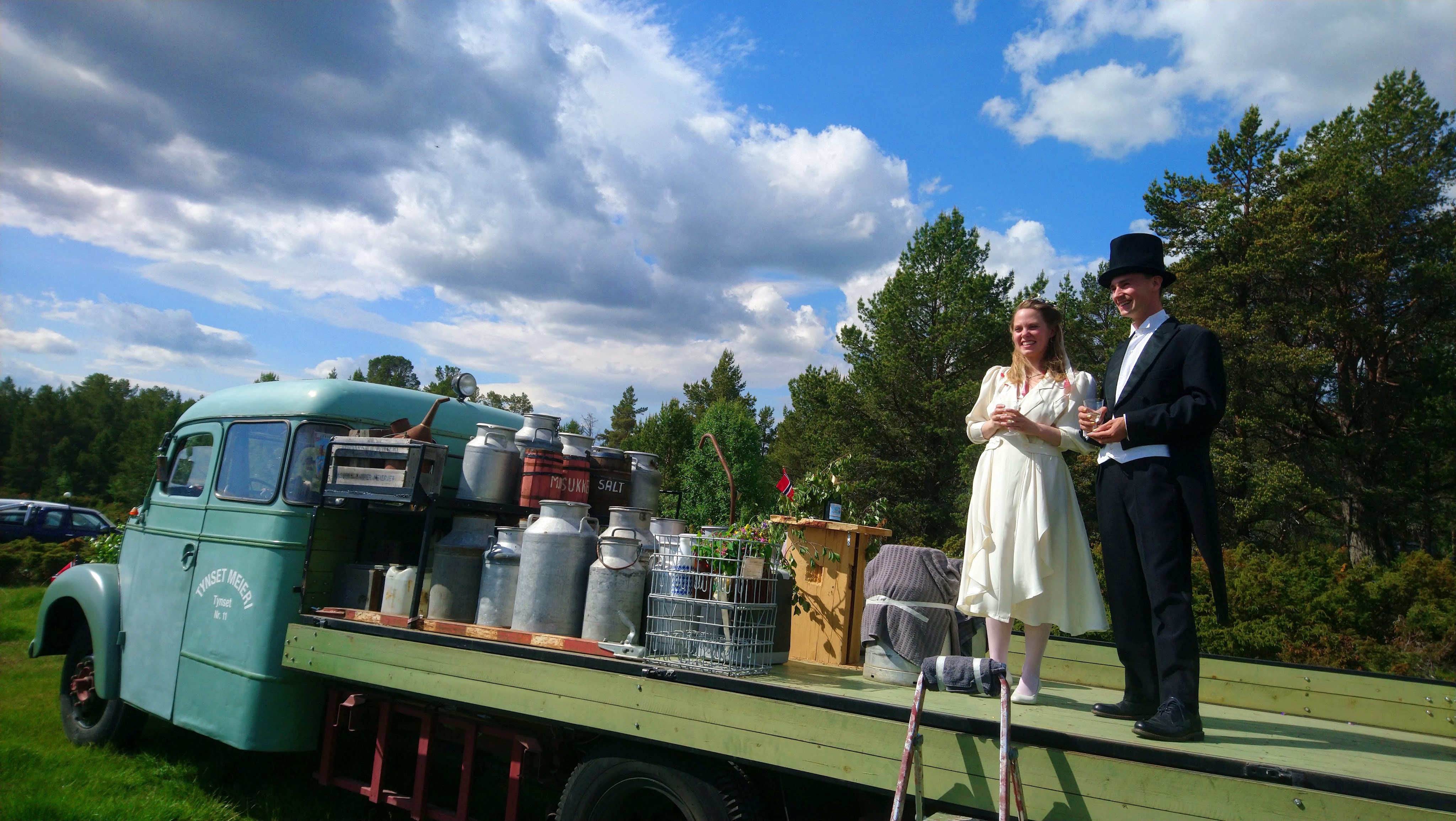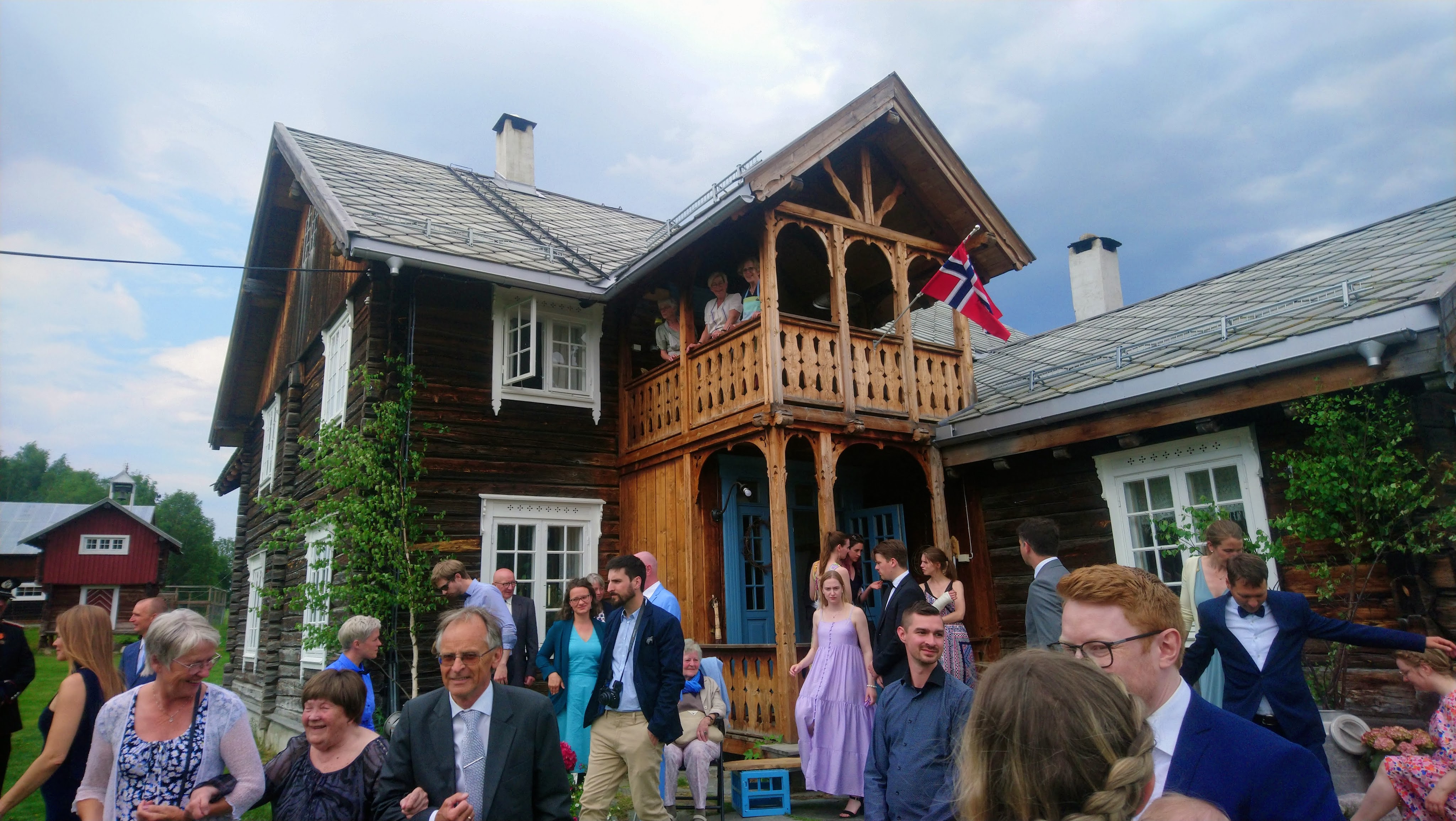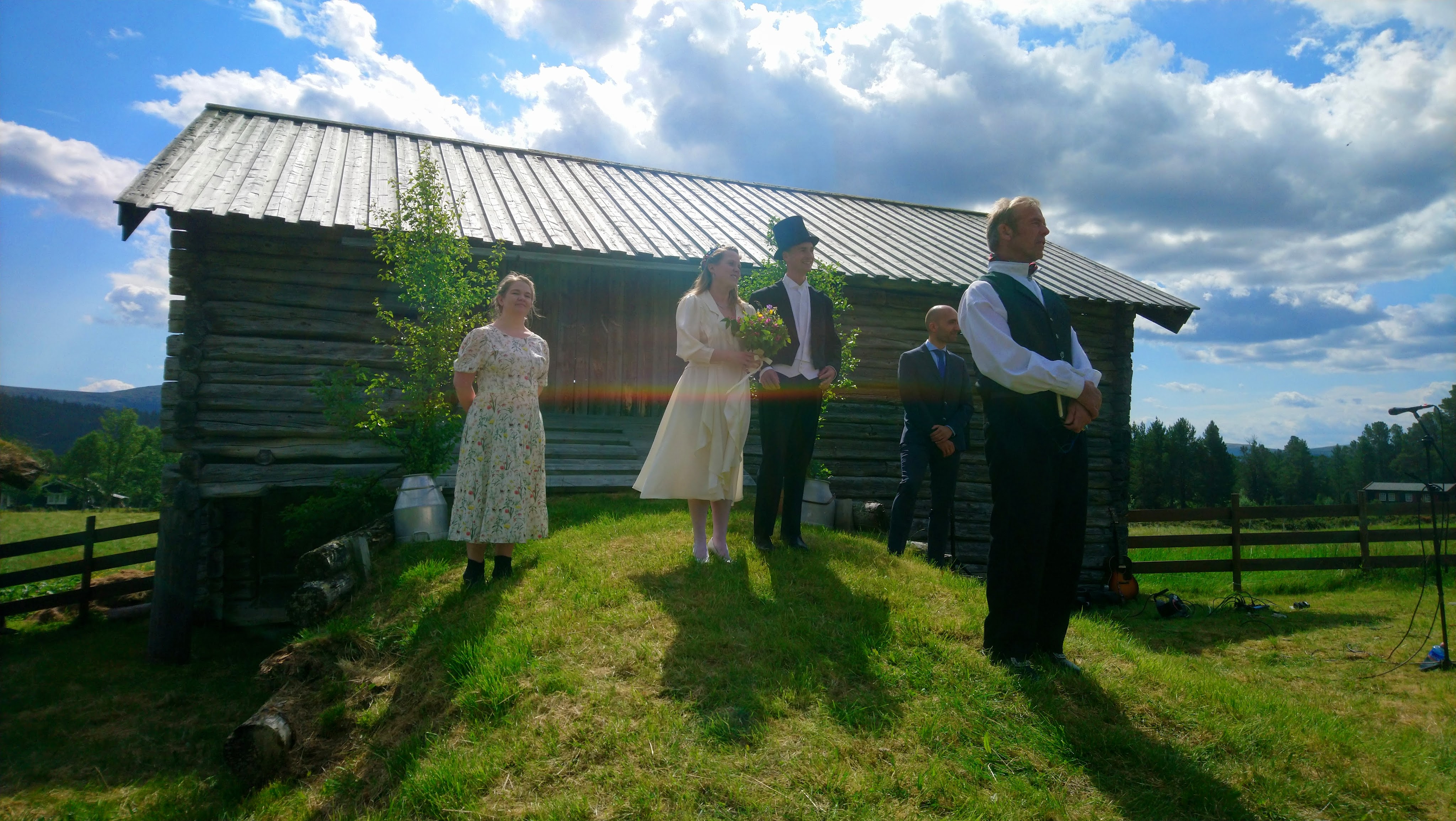 Men før alt dette var det treff på fredagen på parets egen gård, Ålborg, med grilling. Lørdag skulle den største begivenheten skje, og det startet på Ålborg sin seter, Belsvikvangen ved Savalen. De fleste gjester ankom i veteranbuss, som en liten ekstra opplevelse for dem. Vakkert vær, vakre omgivelser, vakre gjester og nydelig brudepar gjorde oss alle rørt, stolte og glade. Siden brudgommen er tysk, men har bodd flere andre plasser rundt i verden, mest i Sverige, var det en ulik forsamling av folk fra fjern og nær. Seremonien var kort, men fin, det ble servert spekemat fra Heidrun, med flatbrød fra deres nabo, Solveig, og det ble holdt en nydelig konsert av de tre, Rønnaug, Kjersti og Oddbjørn, i bandet Rags and feathers, med tilhørighet fra Vingelen og Karmøy. Det hele kunne ikke vært bedre og mer romantisk!