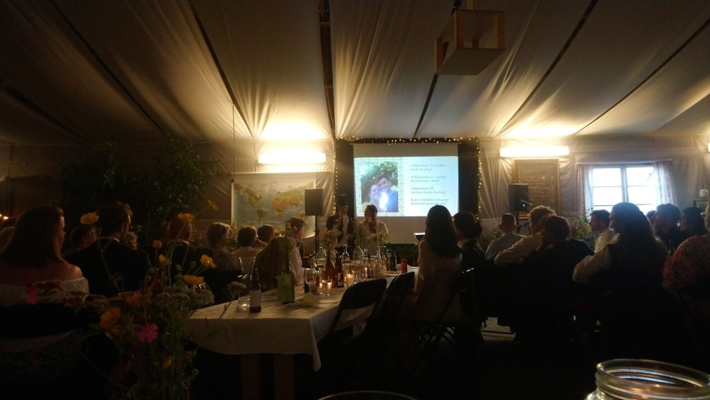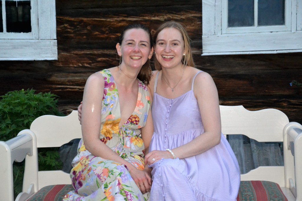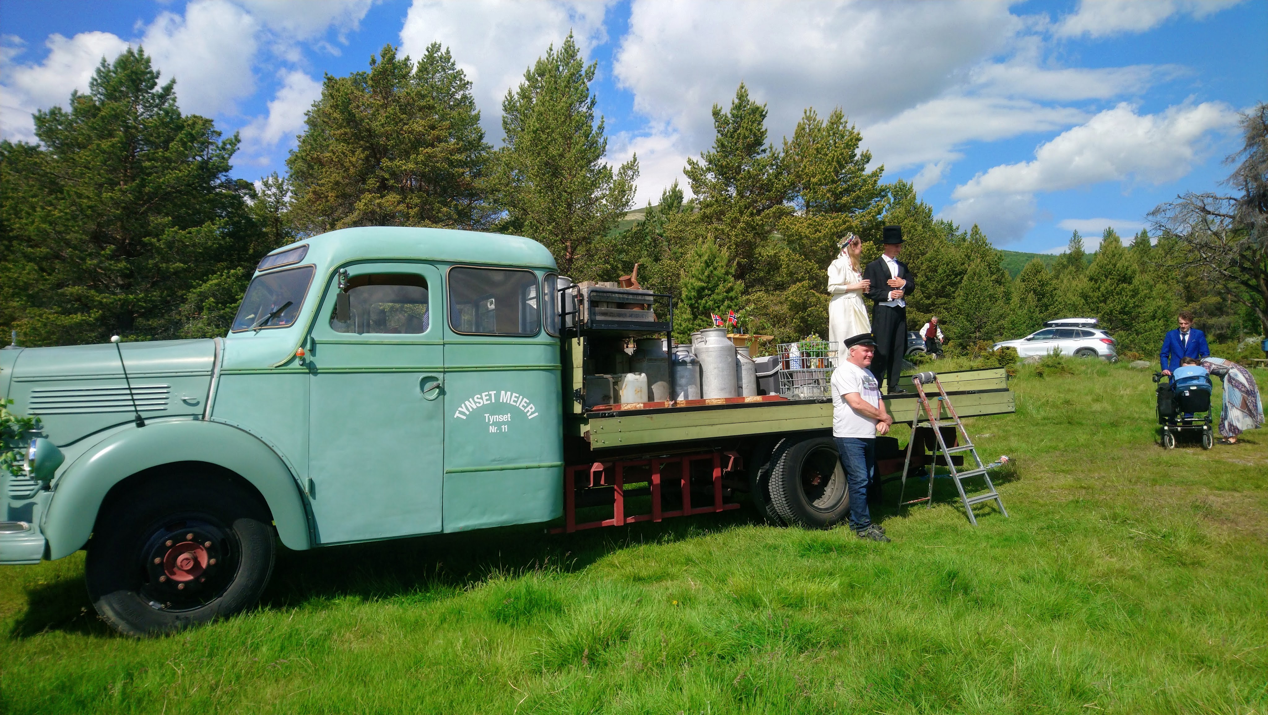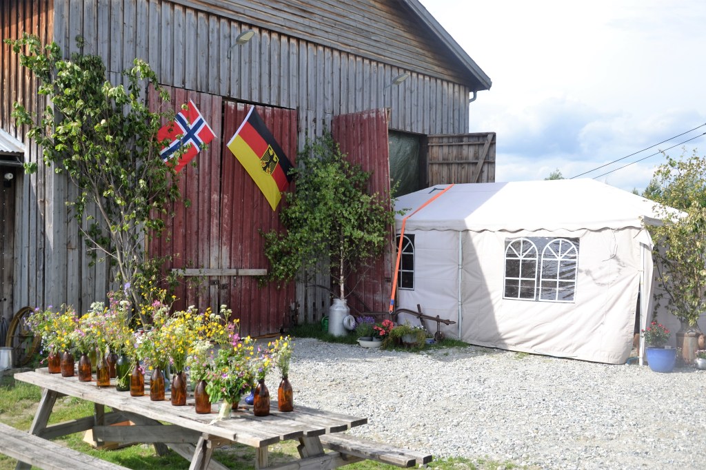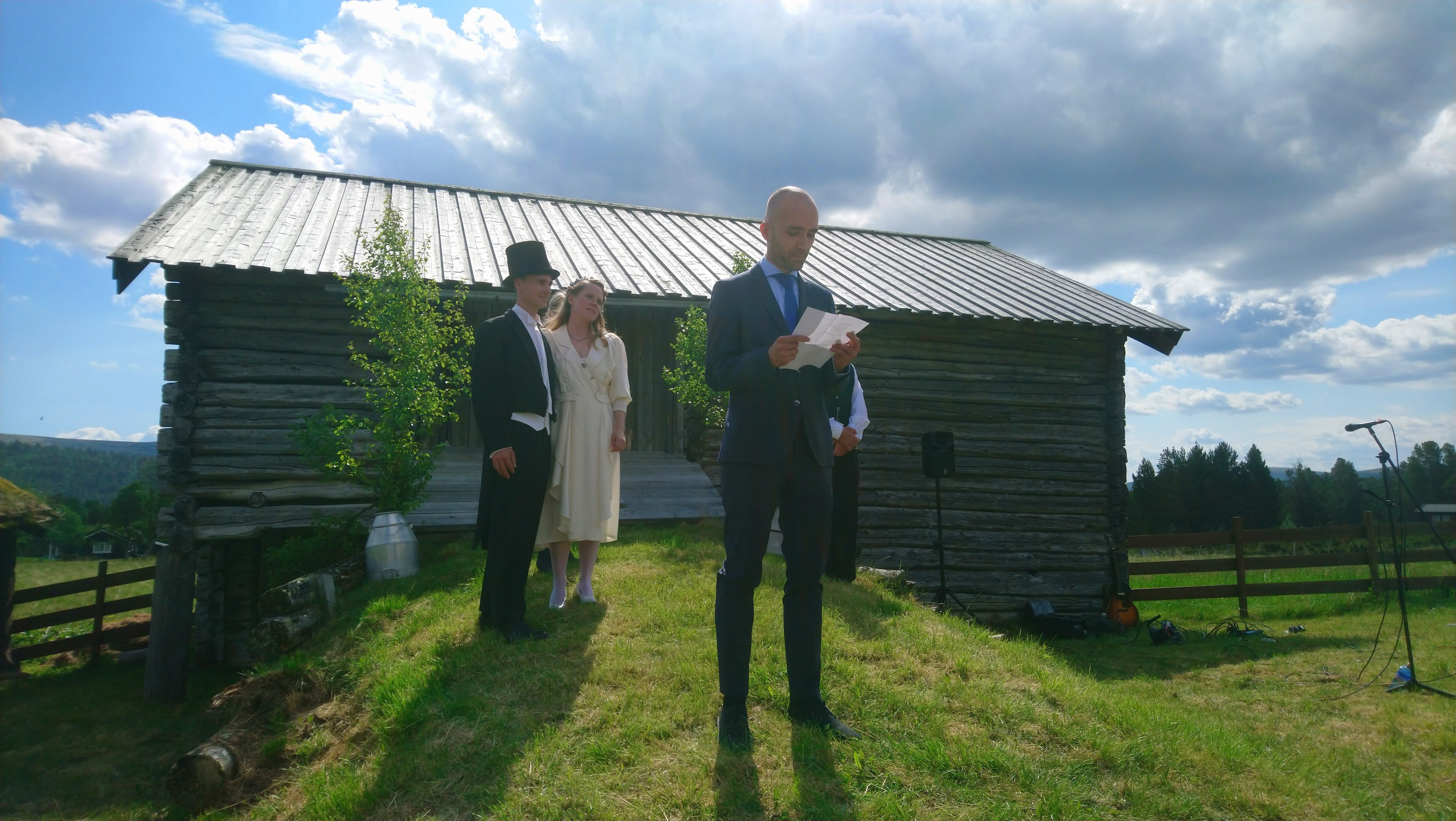 Men før alt dette var det treff på fredagen på parets egen gård, Ålborg, med grilling. Lørdag skulle den største begivenheten skje, og det startet på Ålborg sin seter, Belsvikvangen ved Savalen. De fleste gjester ankom i veteranbuss, som en liten ekstra opplevelse for dem. Vakkert vær, vakre omgivelser, vakre gjester og nydelig brudepar gjorde oss alle rørt, stolte og glade. Siden brudgommen er tysk, men har bodd flere andre plasser rundt i verden, mest i Sverige, var det en ulik forsamling av folk fra fjern og nær. Seremonien var kort, men fin, det ble servert spekemat fra Heidrun, med flatbrød fra deres nabo, Solveig, og det ble holdt en nydelig konsert av de tre, Rønnaug, Kjersti og Oddbjørn, i bandet Rags and feathers, med tilhørighet fra Vingelen og Karmøy. Det hele kunne ikke vært bedre og mer romantisk!