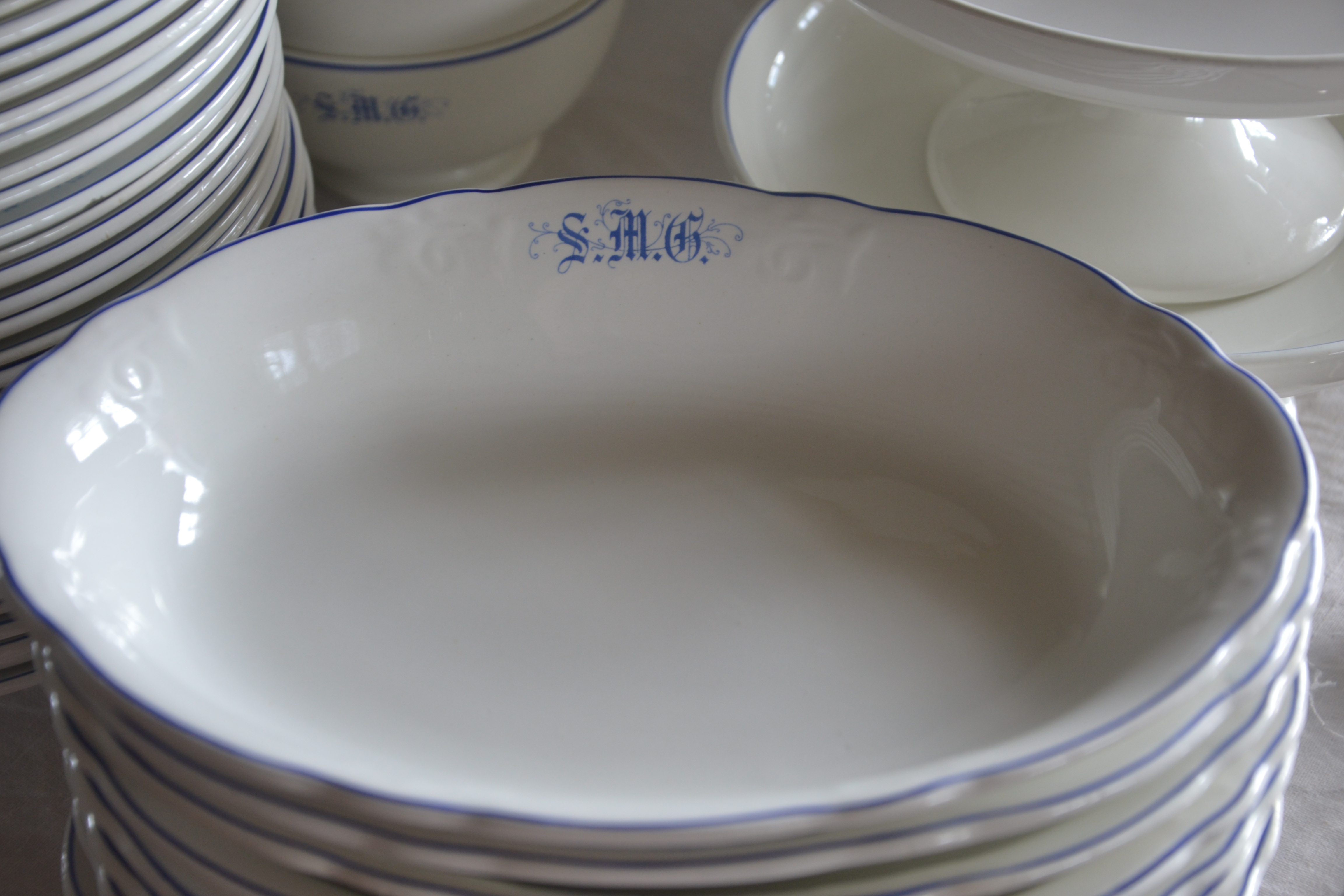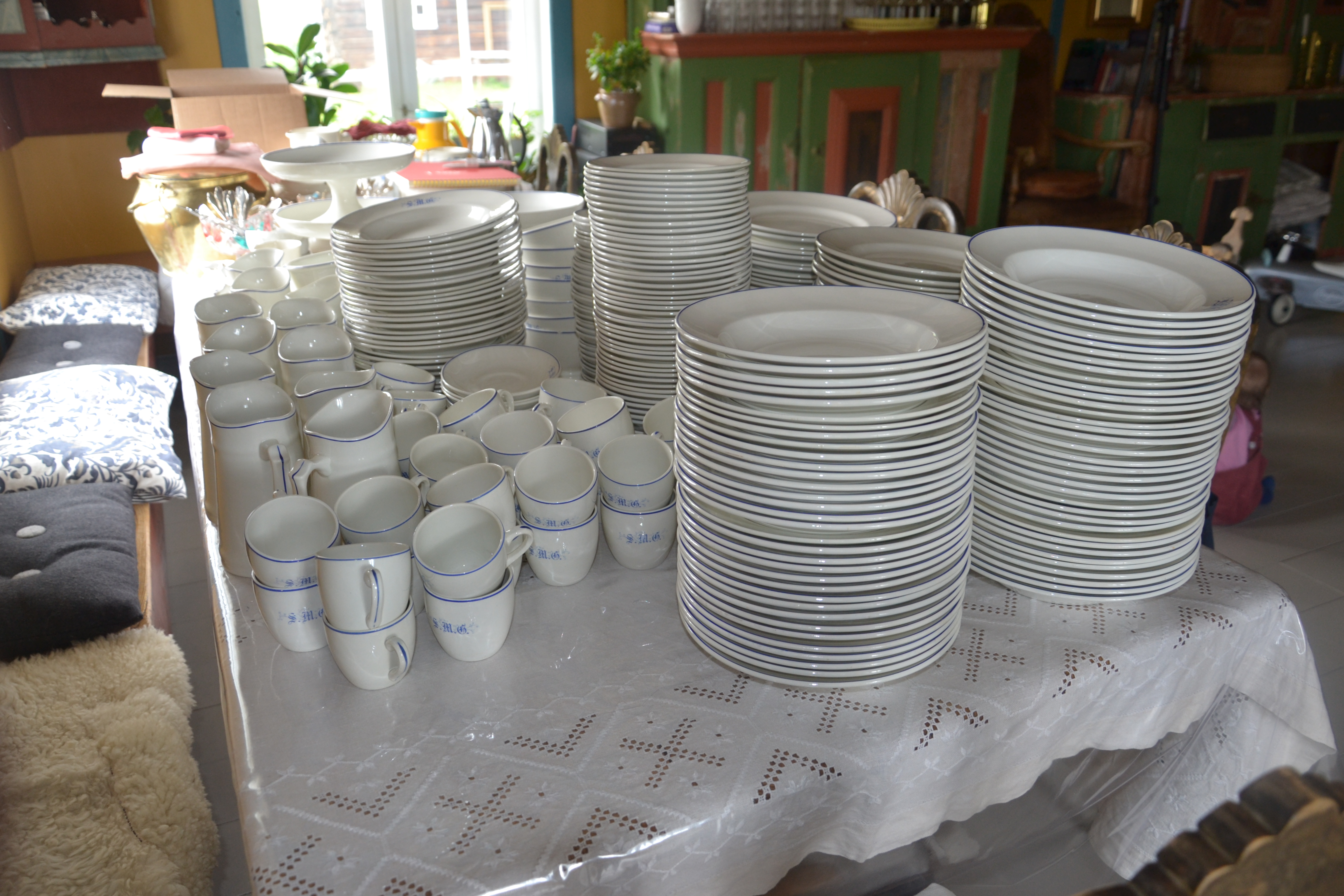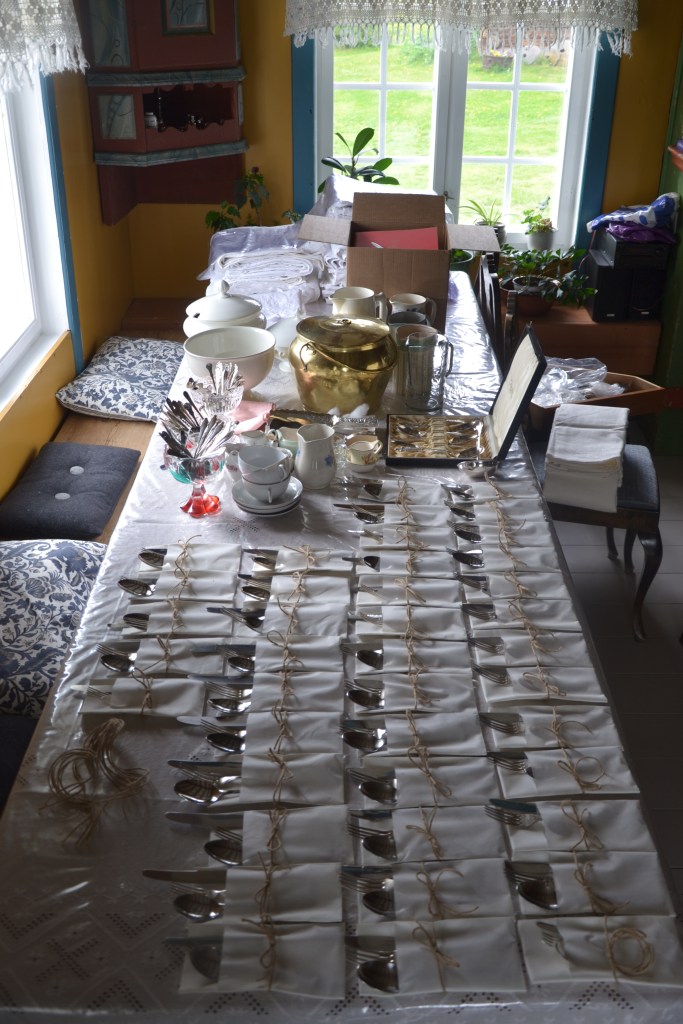 Det er stor aktivitet på mange områder disse ukene. En utfordring er å skaffe nok servise, bestikk, glass, stoler etc til alle gjestene. Vi får vite at det gamle krustøyet – serviset – som har tilhørt Smågardan kruslag, kan lånes fra museet som fikk det donert for noen år siden. (Søk opp innlegget jeg tidligere har skrevet som heter «Dugnad og bearlag» for informasjon om kruslaget.) Vi tar kontakt, og får god hjelp av Bjørg i Museumsparken til å plukke frem og pakke ned alt av deler som vi måtte trenge! Serviset er fra «Egersunds fayancefbrik» og merket med bokstavene SMG «Smågardan kruslag» og er ganske så vakkert, syns vi.