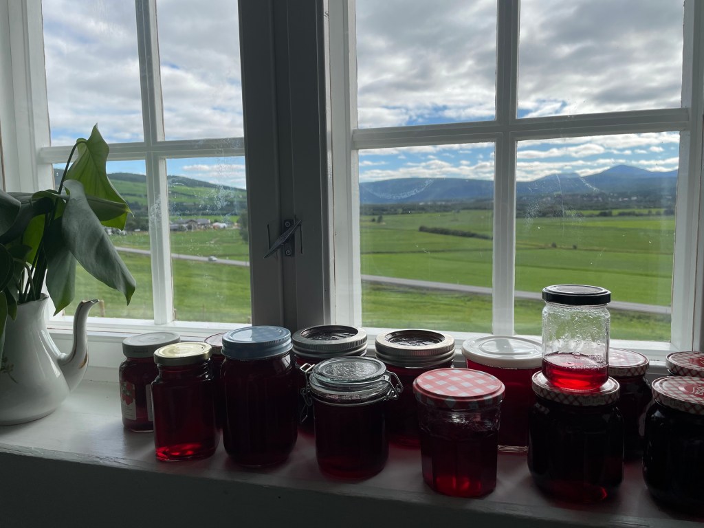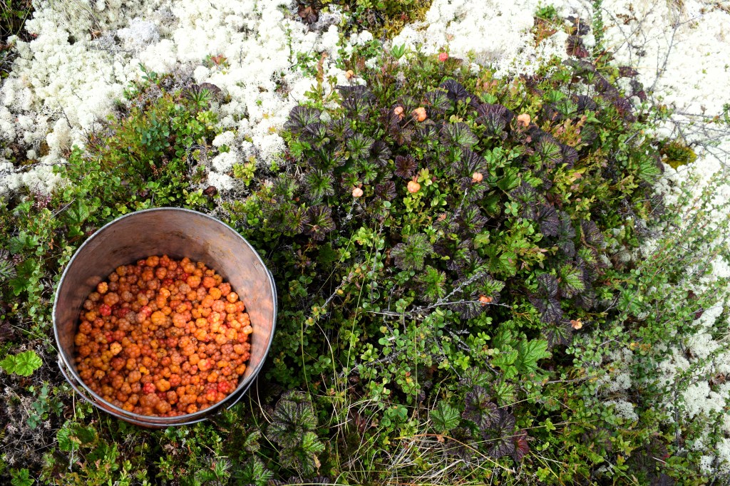 Nå gjenstår «bare» resten. Vi har flere busker med rips som ennå ikke er rørt, samt solbær og stikkelsbær og dessuten må vi prøve å få tak i litt bringebær. Og hva med blåbær og tyttebær…? Multer plukket vi før det verste regnværet satte inn. Vi fant store mengder, men bærene var ikke bare av topp kvalitet, da de så ut til å ha blitt råket av hagl tidligere i sommer. Siden sola skinner og temperaturen igjen ligner sommer, blir det nok mer bær i saftkokeren i løpet av helga. Noen på gården har også planer om soppturer, så her skal krukker og frysere fylles!